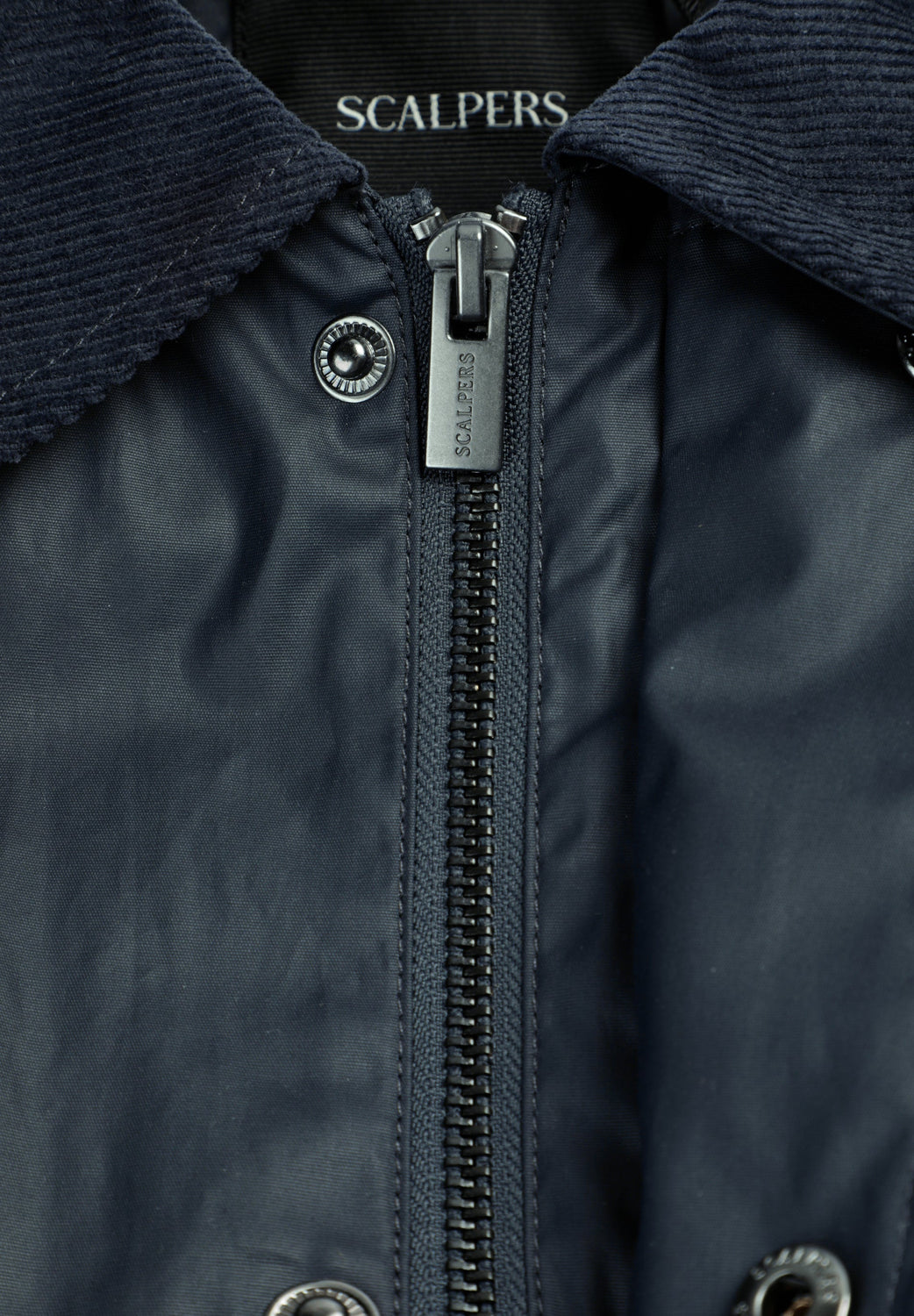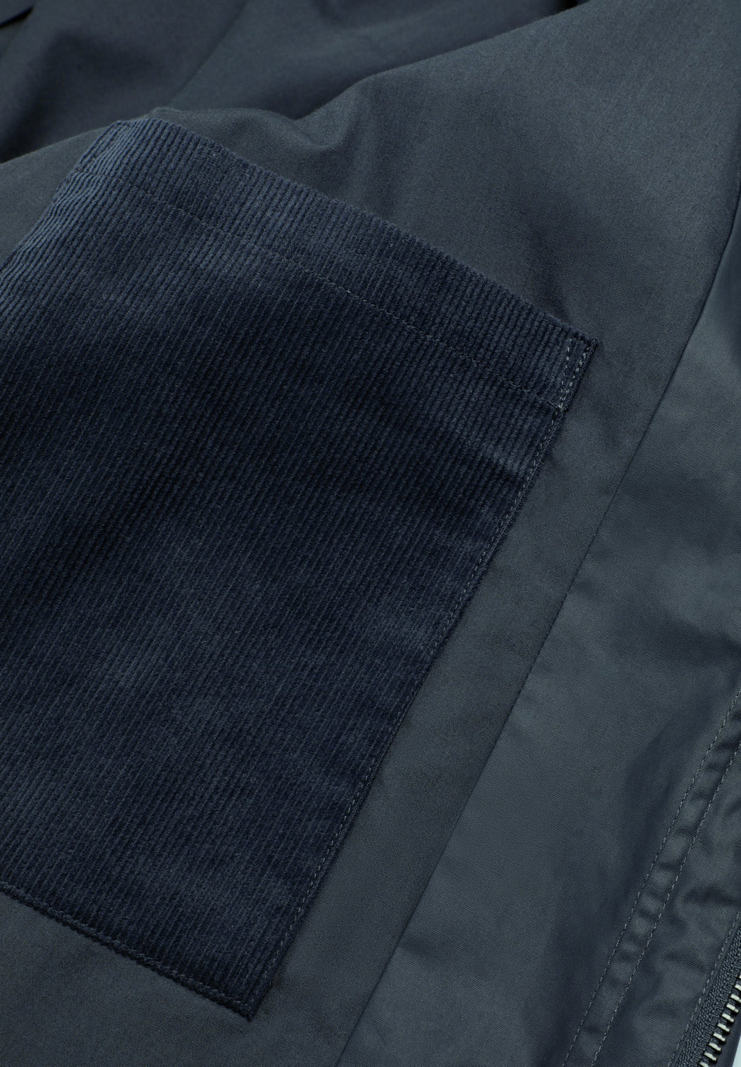 Veste 100 % coton BCI. Tissu à effet ciré. Deux poches sur le devant. Col et poche intérieure en velours côtelé. Fermeture Éclair dissimulée devant sous une patte à boutons-pression.