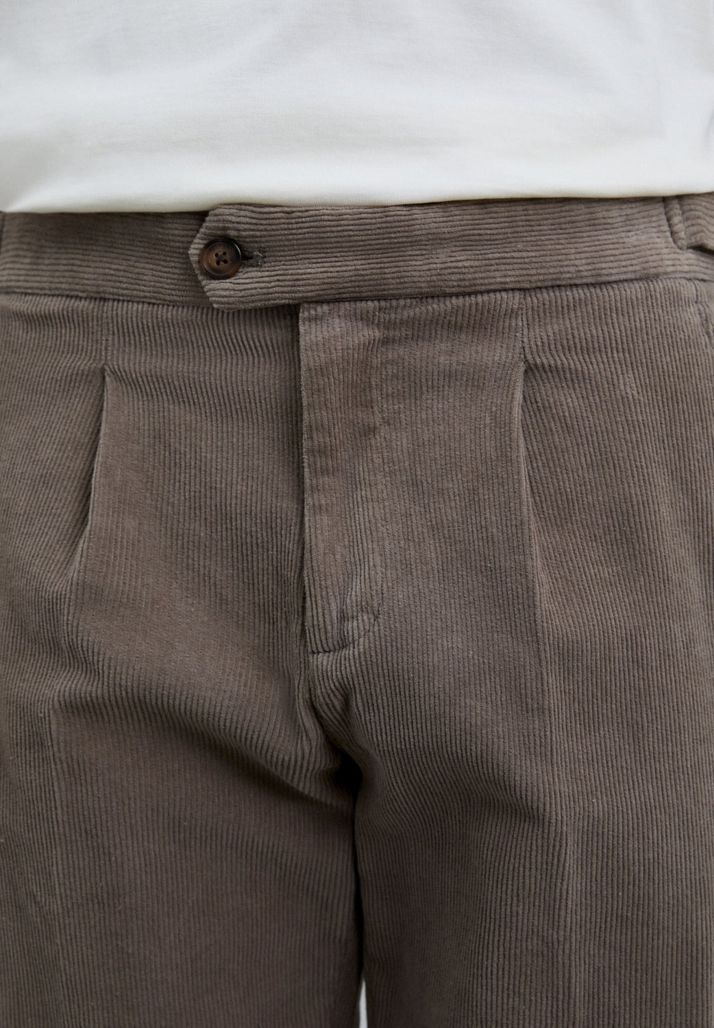 Pantalon à pinces en velours côtelé en coton BCI. Coupe slim. Ajusteurs en métal sur les côtés à la taille, bouton et fermeture éclair. Deux poches avant et deux poches arrière à bouton.