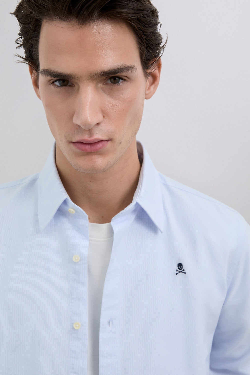 Chemise 100 % coton. Imprimé rayé. Coupe droite, col italien et boutons. Manches longues à poignets boutonnés. Skull contrastant brodé sur la poitrine.