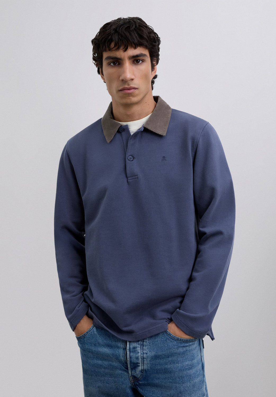 Polo 100 % coton BCI. Col à boutons en velours côtelé contrastant. Manches longues. Logo brodé ton sur ton sur la poitrine.