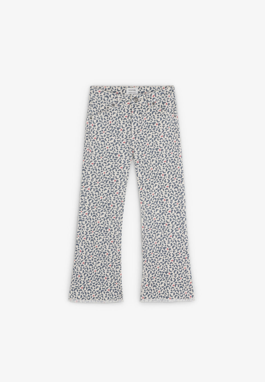 Jean. Deux poches sur le devant. Deux poches arrière avec étiquette avec logo et skull. Effet effiloché dans le bas. Passants de ceinture. Bouton et fermeture éclair. Motif animal.