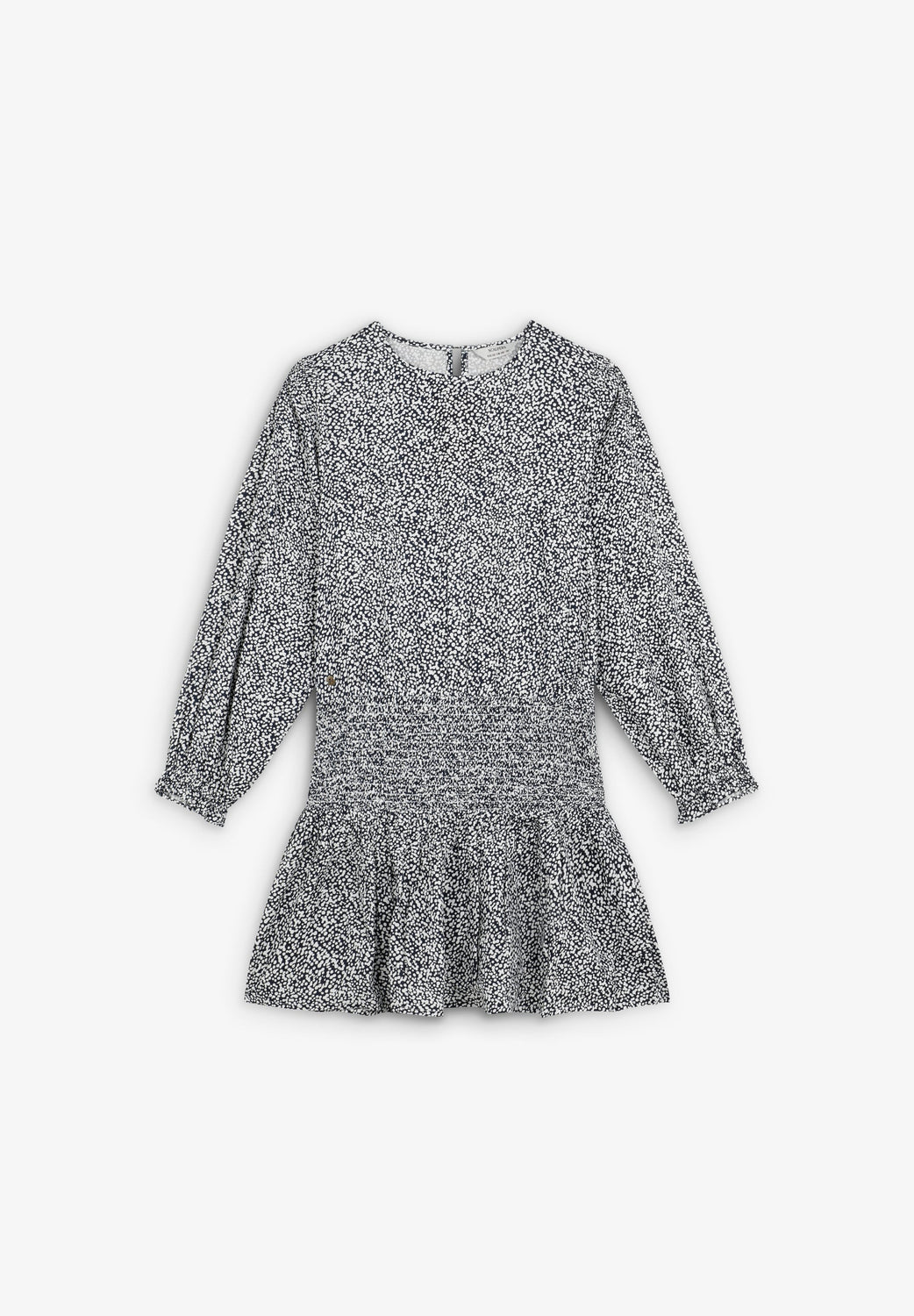 Mini-robe. Coupe droite. Col rond. Manches longues légèrement bouffantes à poignets froncés. Nid d’abeille et skull à la taille. Boutonnée dans le dos.
