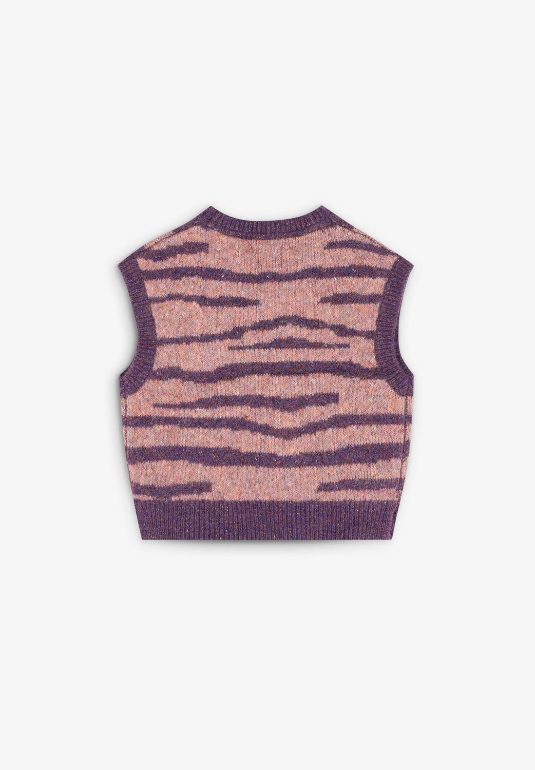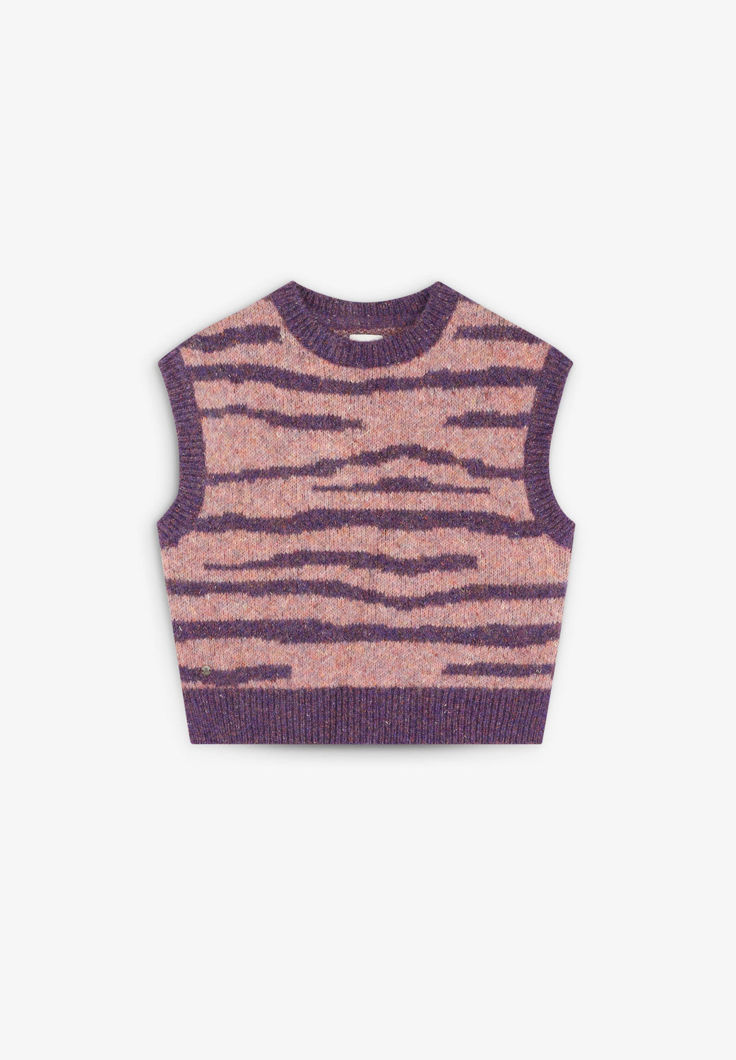 Pull sans manches en maille. Col rond. Finitions en bord de côte contrastants. Motif animal.
