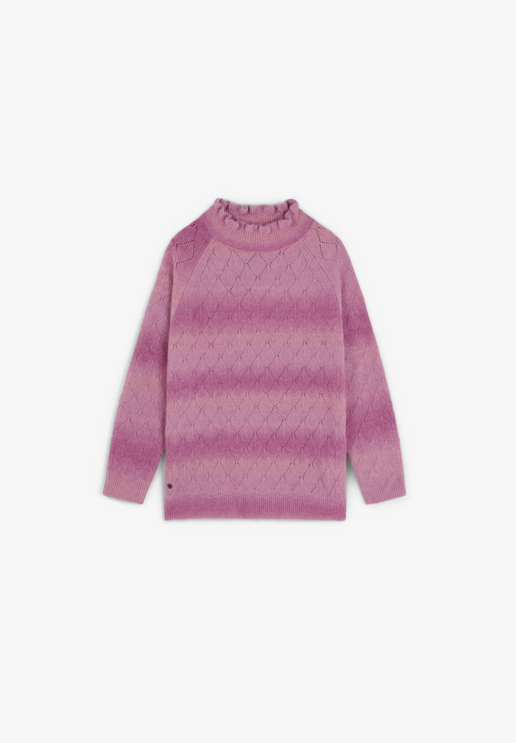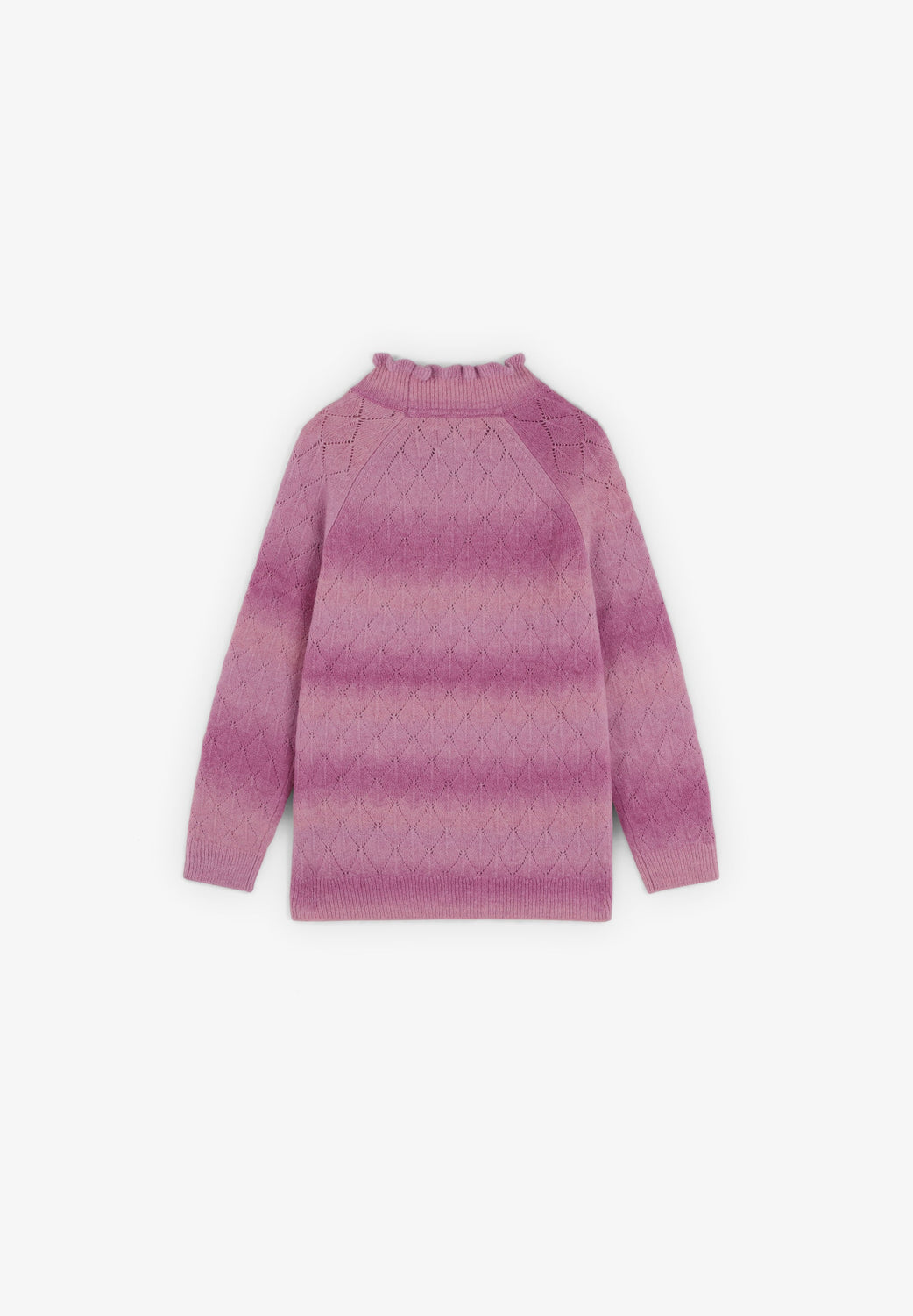 Pull en maille confectionné dans un mélange de laine mérinos. Col montant à volants. Manches longues à finitions côtelées. Motif losanges ajouré.
