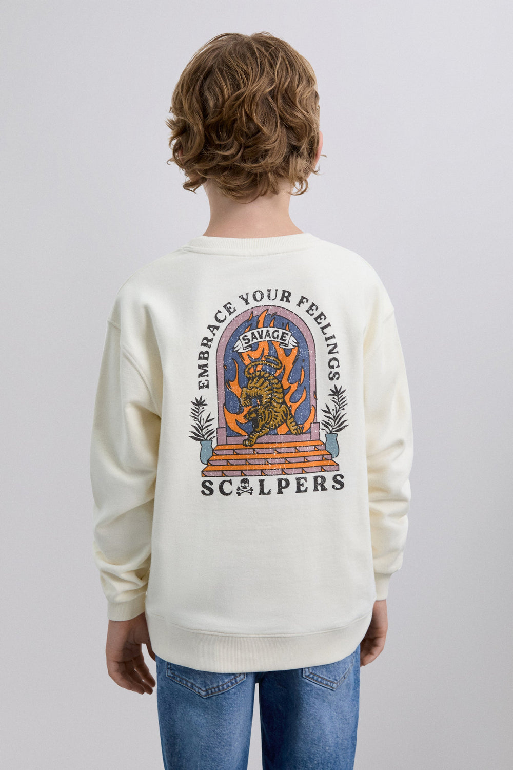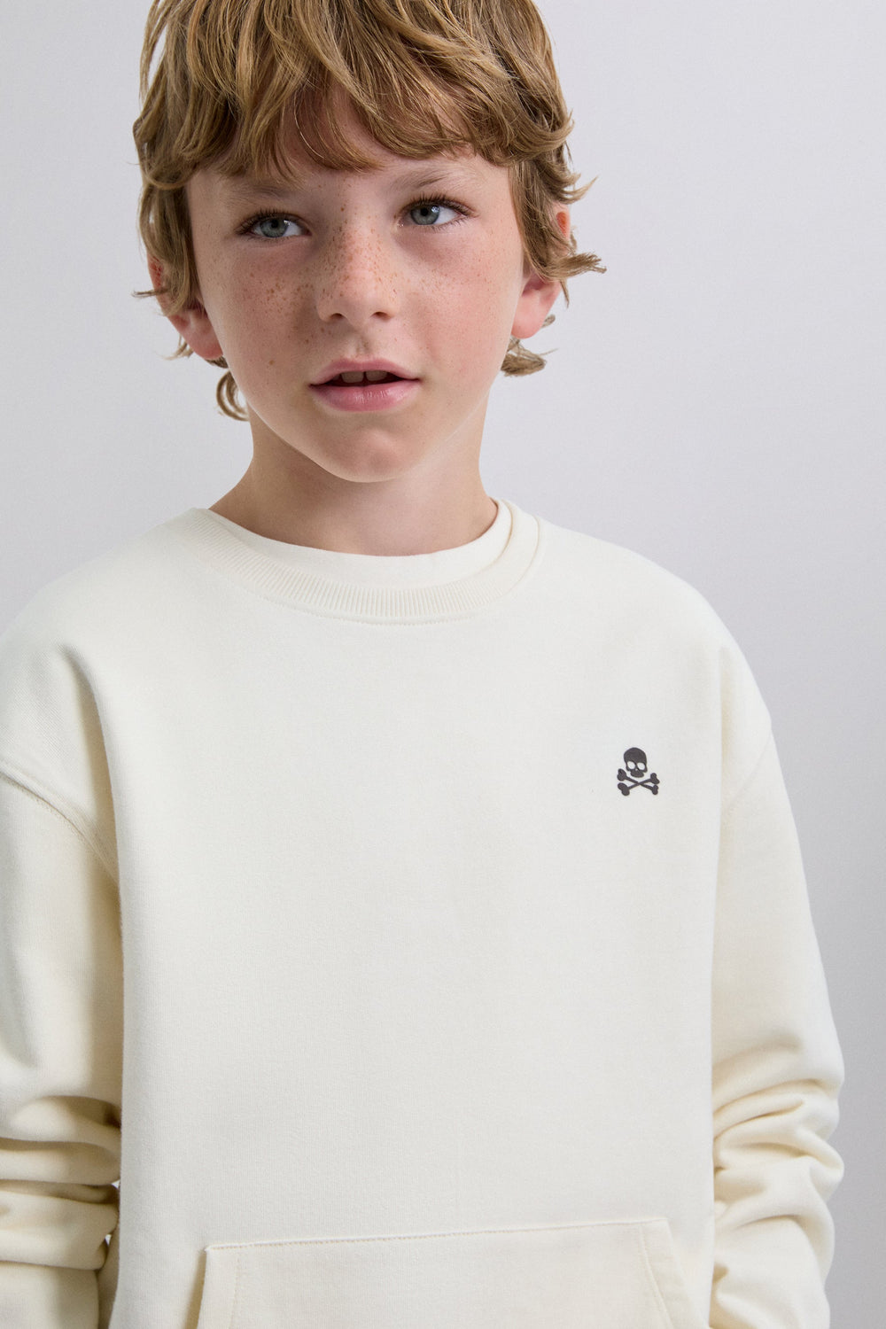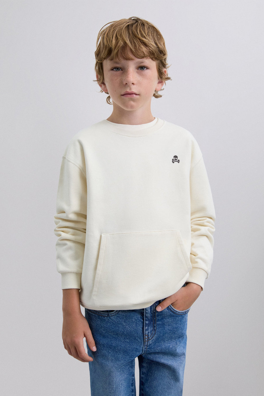 Sweat 100 % coton BCI. Imprimé dans le dos et skull sur la poitrine. Col rond. Manches longues à poignets resserrés et poche kangourou devant.
