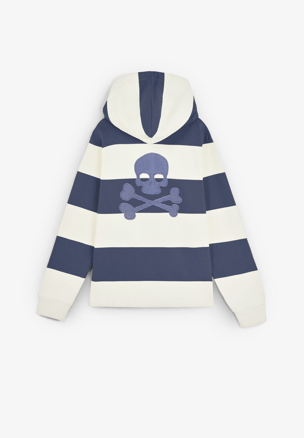 Sweat à capuche réglable avec un lien 100 % coton BCI. Imprimé rayé. Motif brodé sur la poitrine et skull dans le dos. Col boutonné devant.