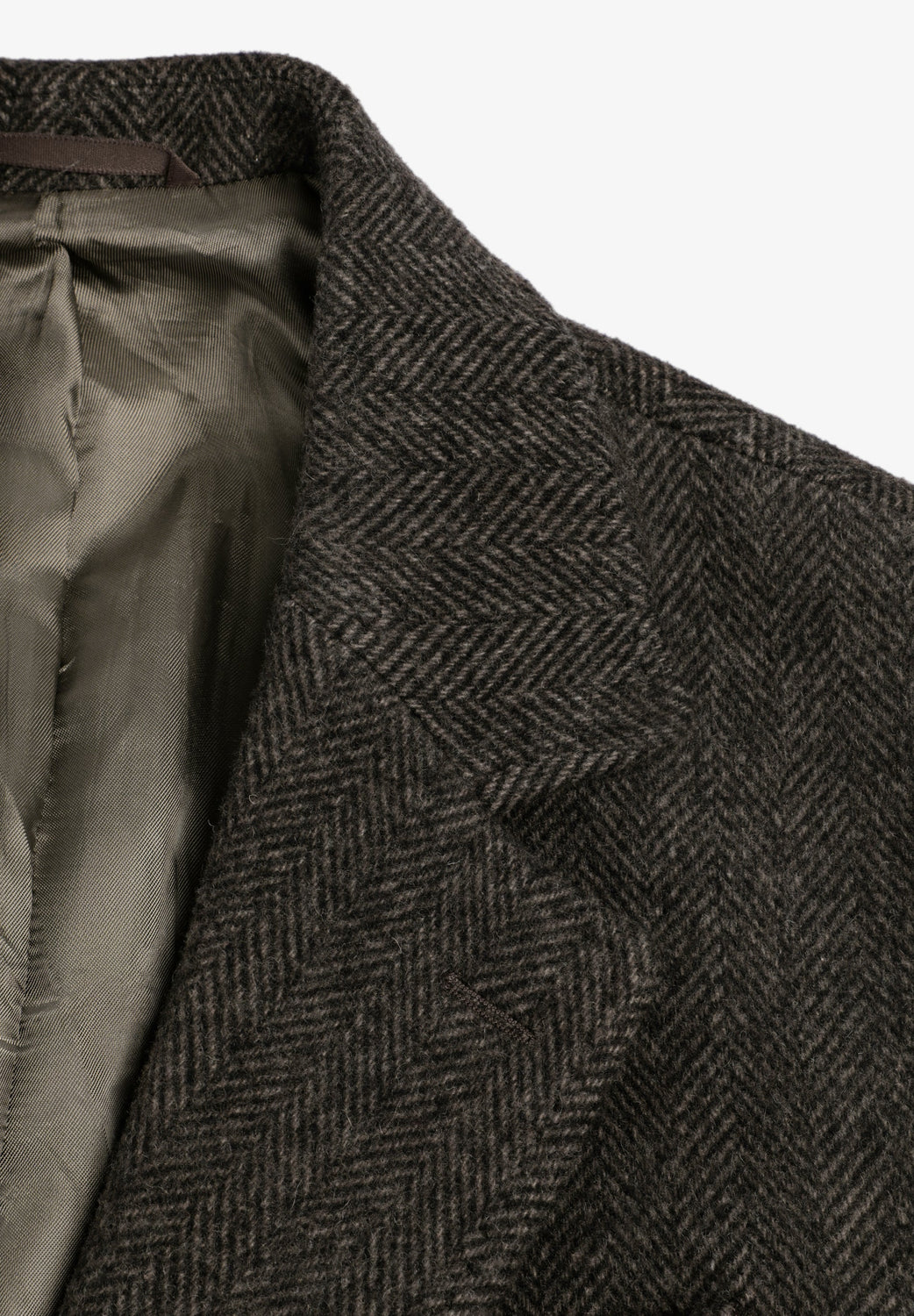 Manteau à chevrons dans les tons bruns. Col à revers. Poches à double rabat, fermeture à bouton sur le devant. Sensation de brossage.