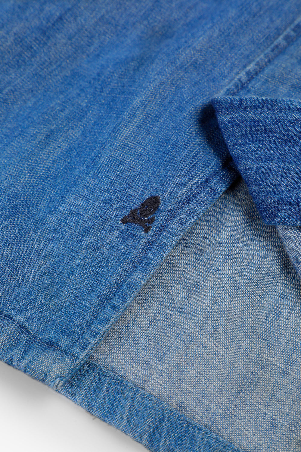 Chemise denim confectionnée en 100 % coton BCI. Coupe droite. Col chemise. Boutonnée devant. Manches longues. Poignets boutonnés. Poche au niveau de la poitrine. Logo brodé sur la patte de boutonnage.