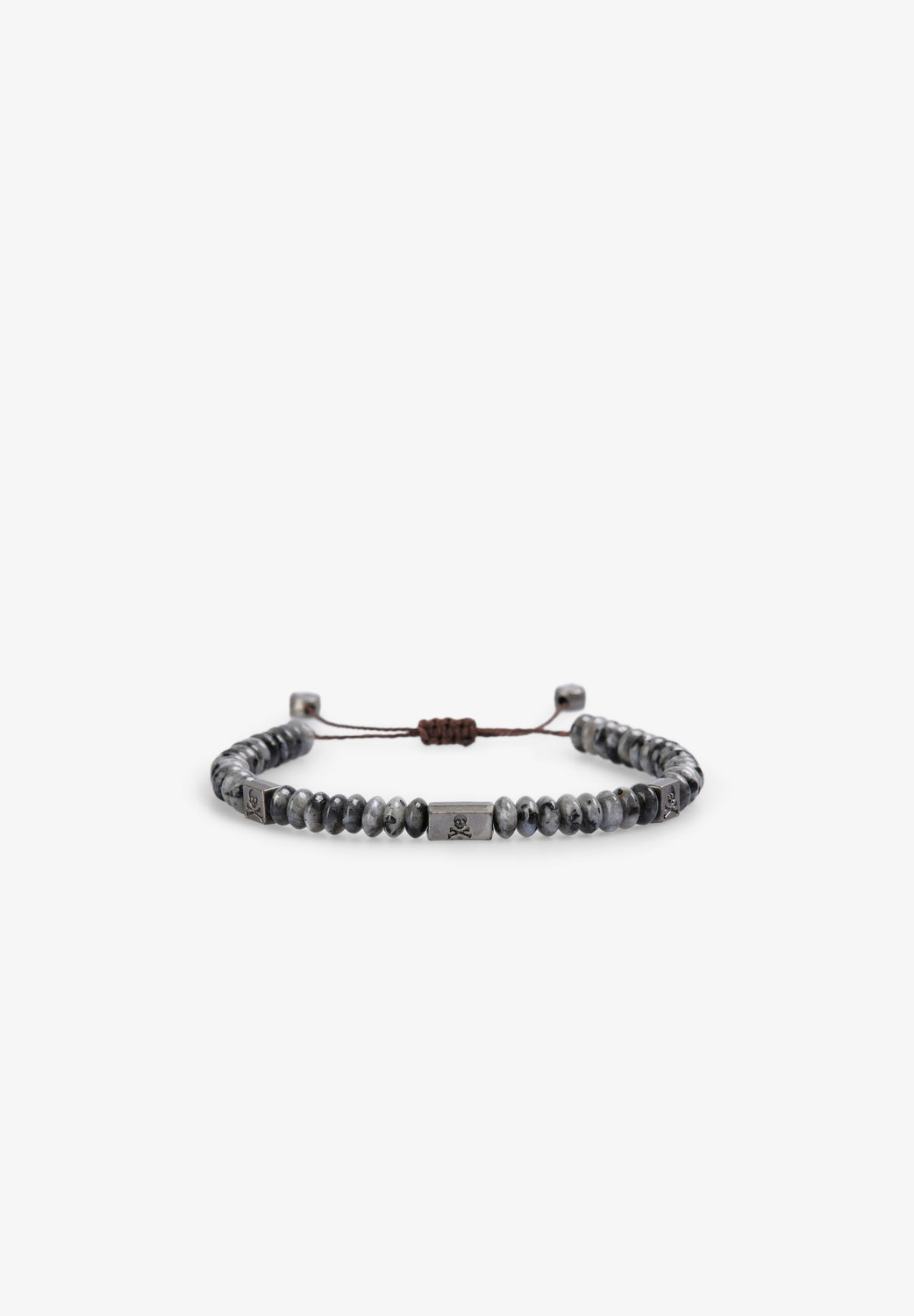 Bracelet en pierre naturelle. Appliques métalliques avec logo. Fermeture réglable au poignet.