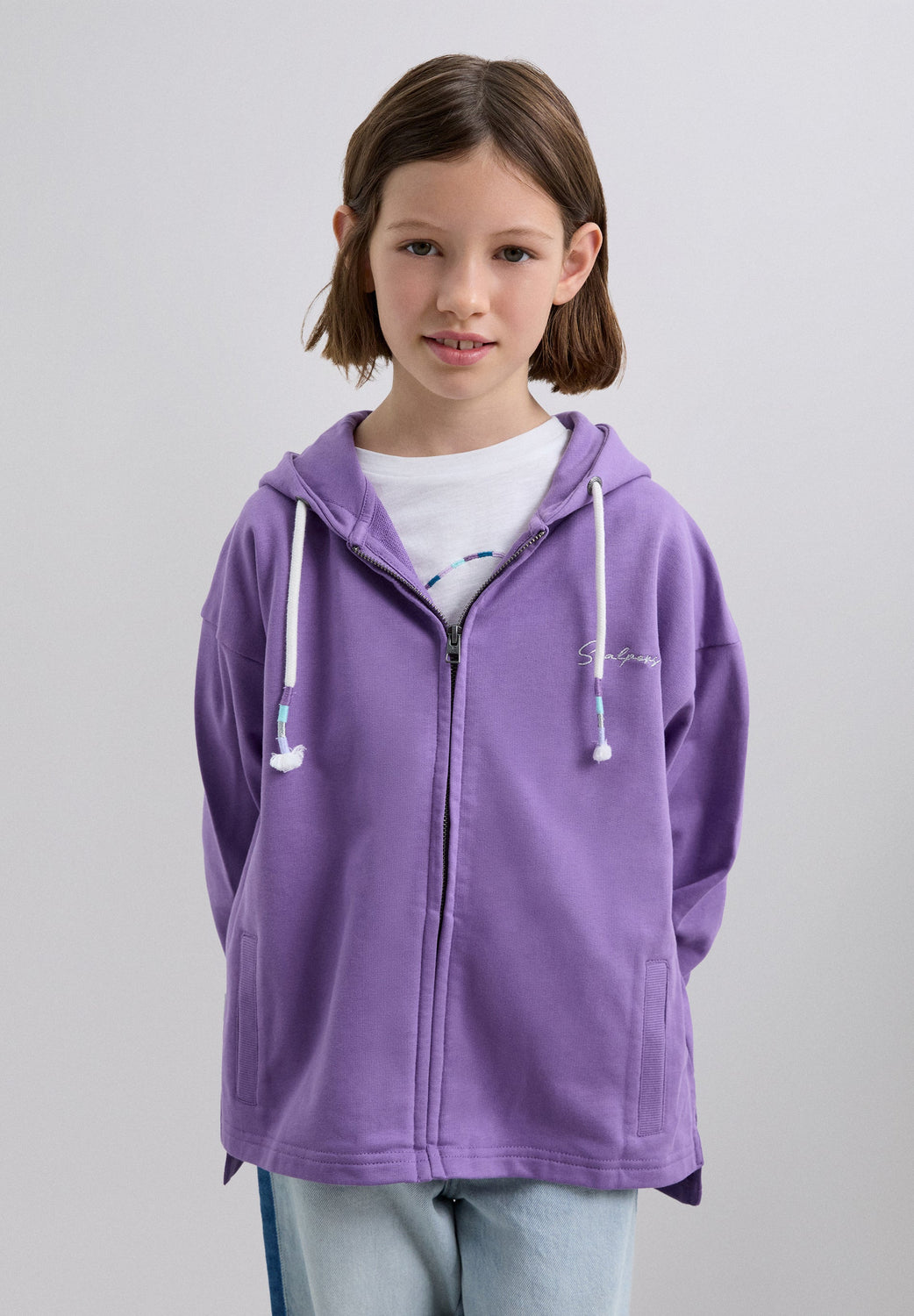 Sweat à capuche réglable avec cordon de serrage. Fermeture éclair devant. Manches longues avec poignets finition bord de côte. Logo brodé sur la poitrine et skull clouté dans le dos.