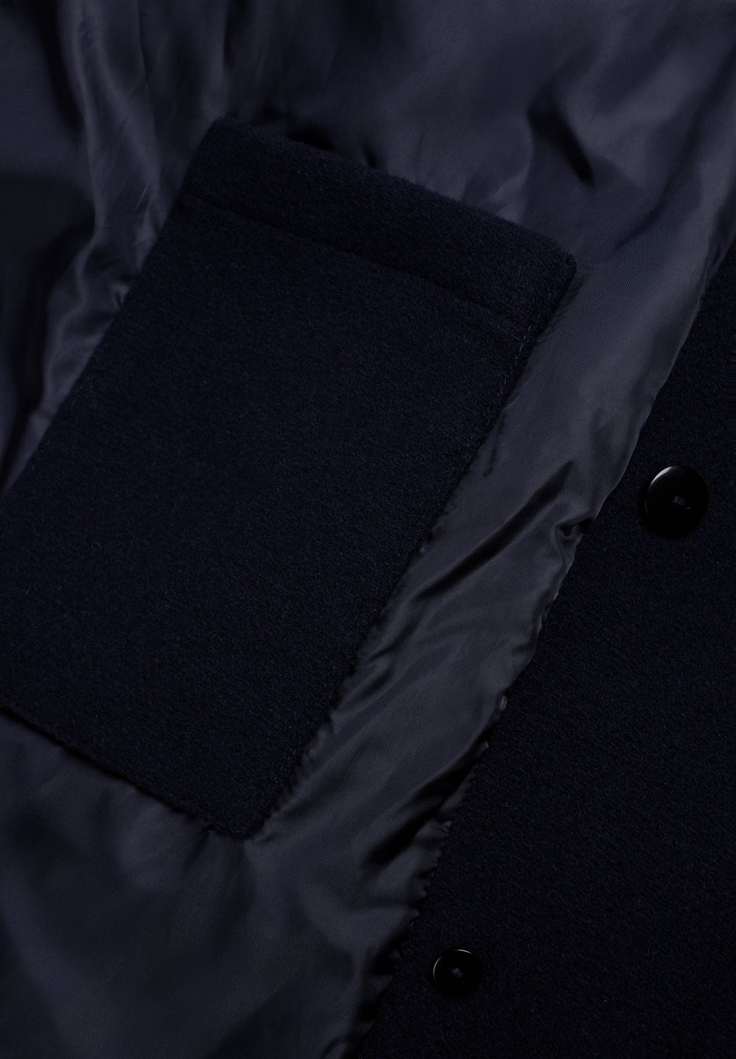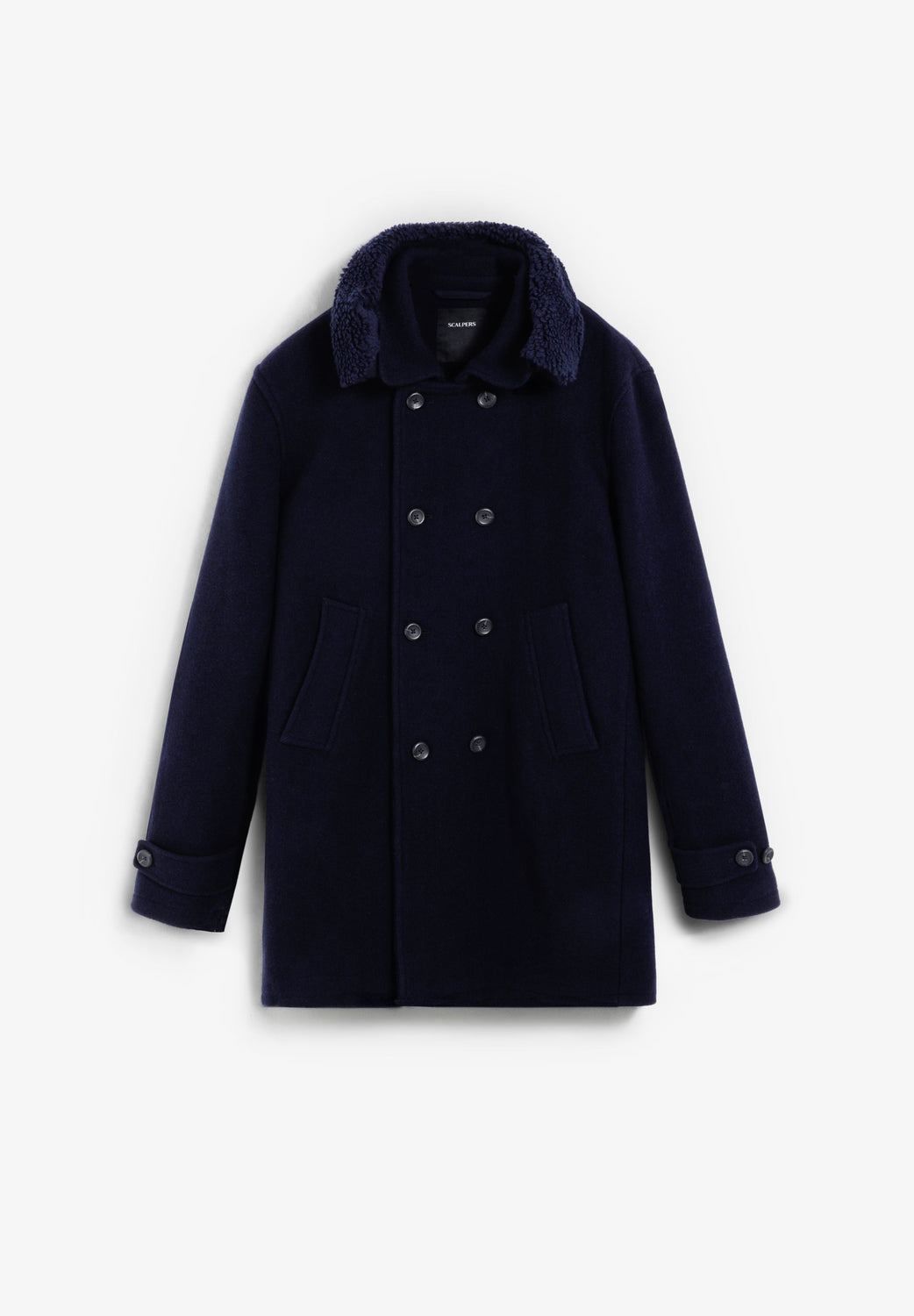 Manteau croisé en laine. Fermeture boutonnée, passants sur les poignet. Deux grandes poches passepoilées en biais. Poche intérieure. Détail amovible sur le col.