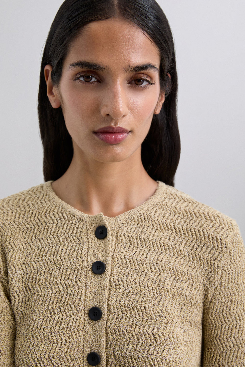 Cardigan en maille. Col rond. Manches longues. Boutons contrastants devant.