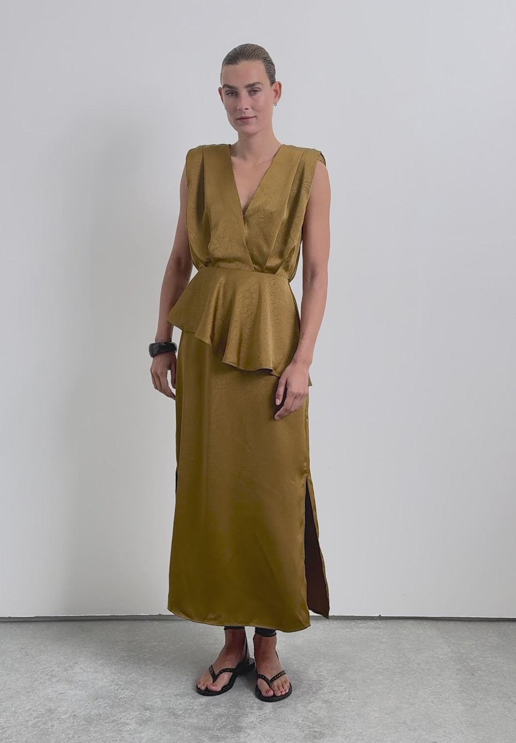 Jupe midi en tissu fluide texturé. Fermeture éclair dissimulée sur le côté et fente le long de la jambe.
