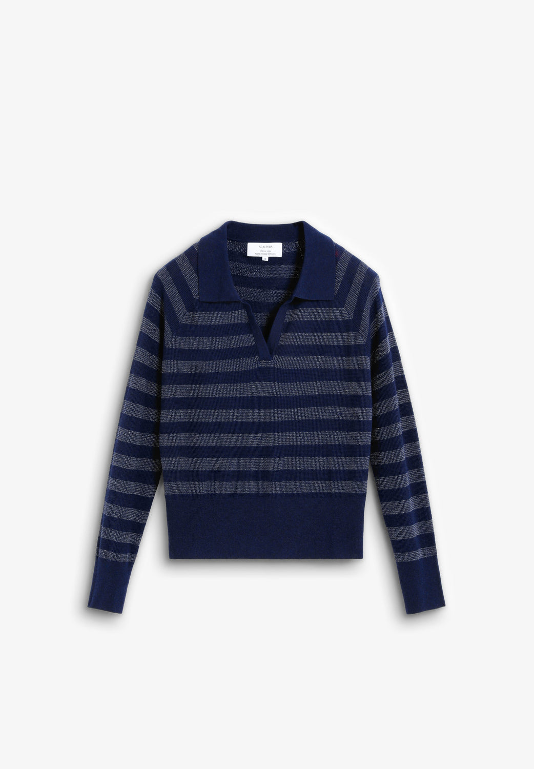 Pull style polo, confectionné dans un mélange de laine. Coupe droite. Motif rayures en fil métallisé. Col polo. Manches longues avec poignets en bord-côte.