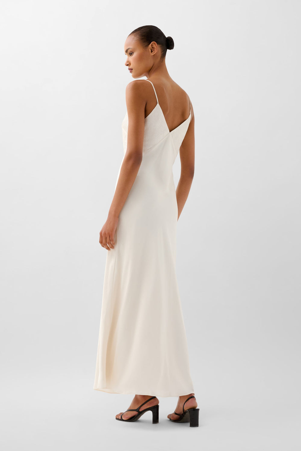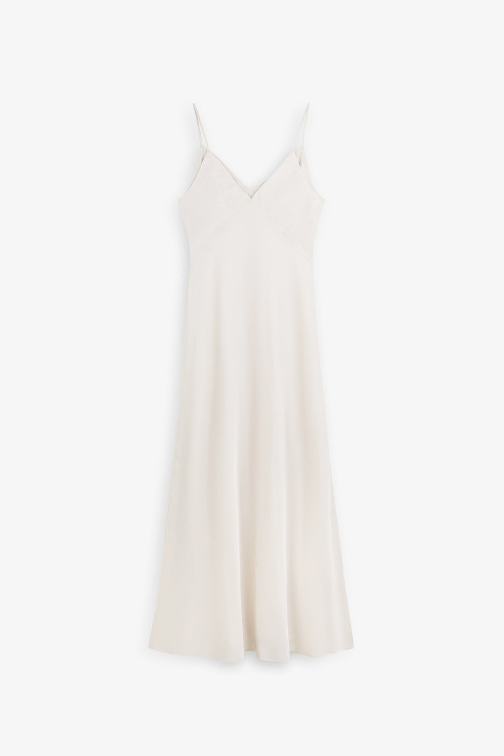 Robe en tissu fluide texturé. Coupe slim, modèle long, fines bretelles réglables, décolleté en V.
