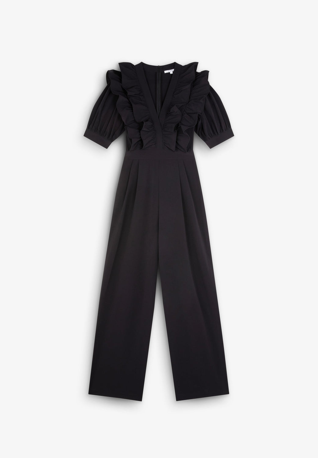 Combinaison noire. Coupe regular, encolure en V avec volants, manches bouffantes, taille cintrée et pantalon coupe Full Length. Fermeture éclair à l’arrière.