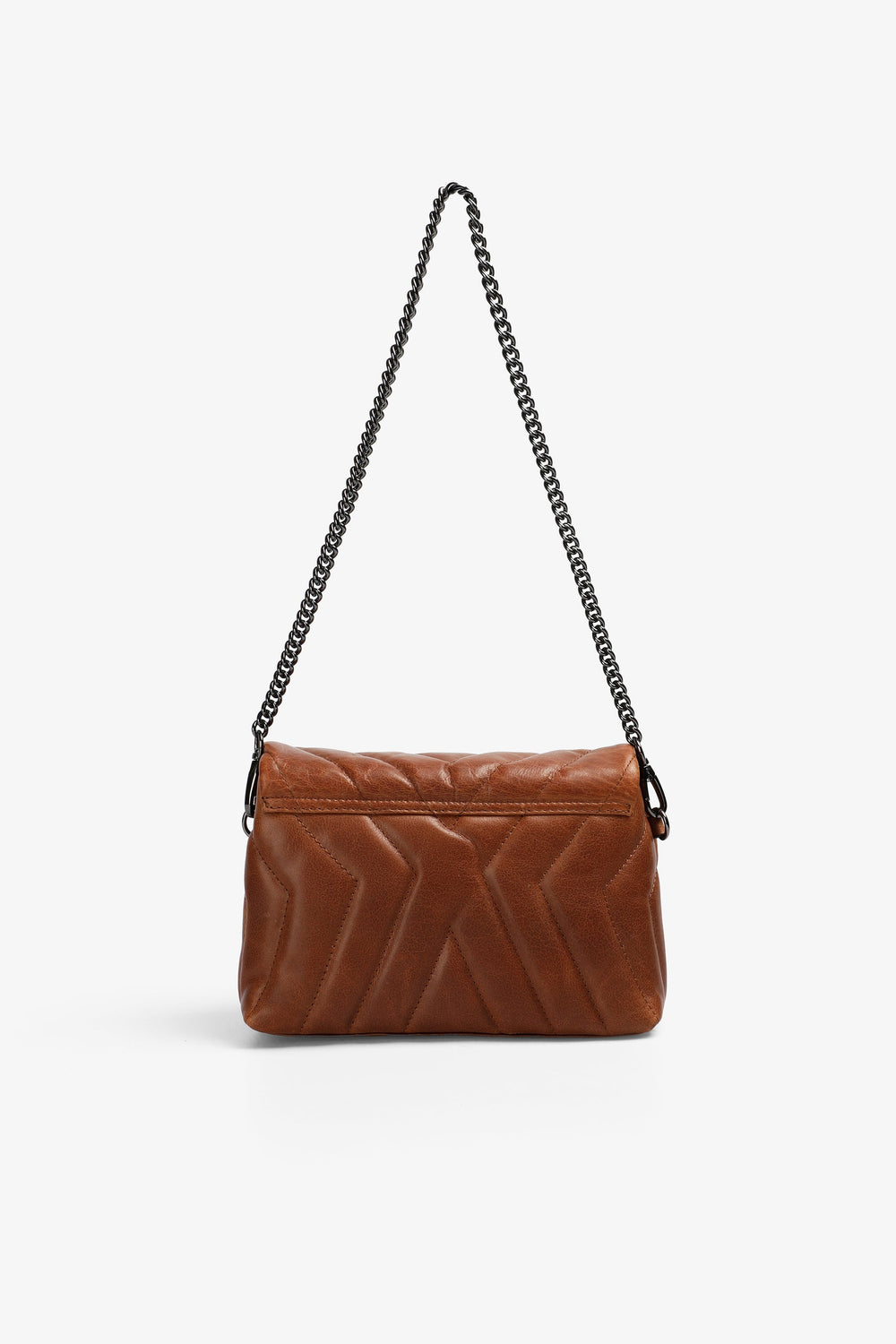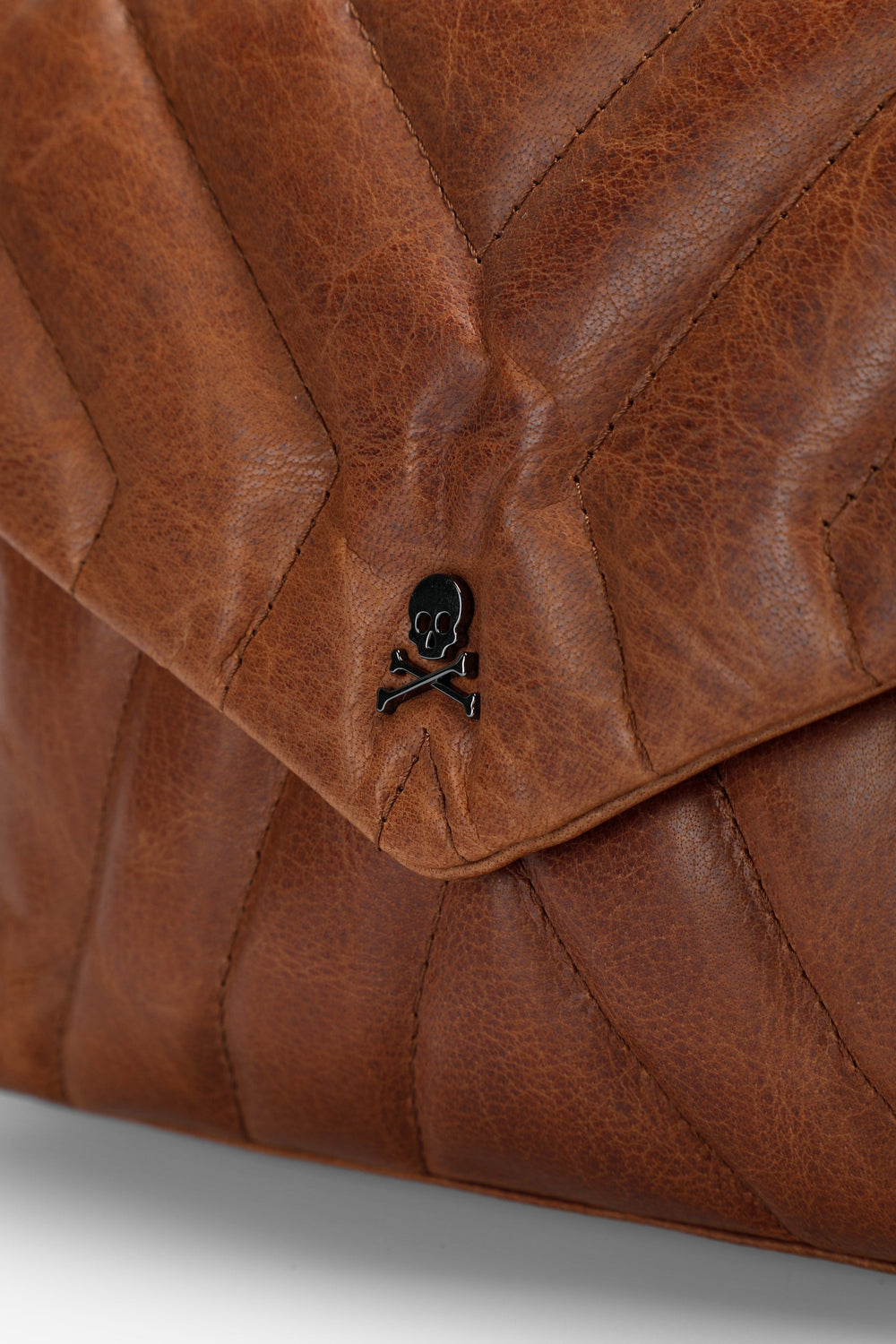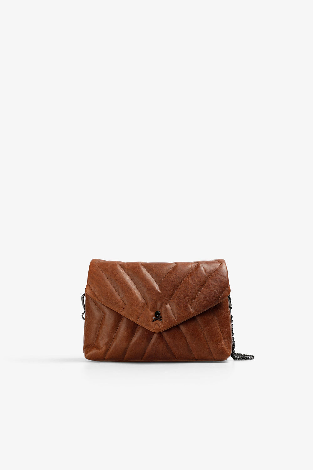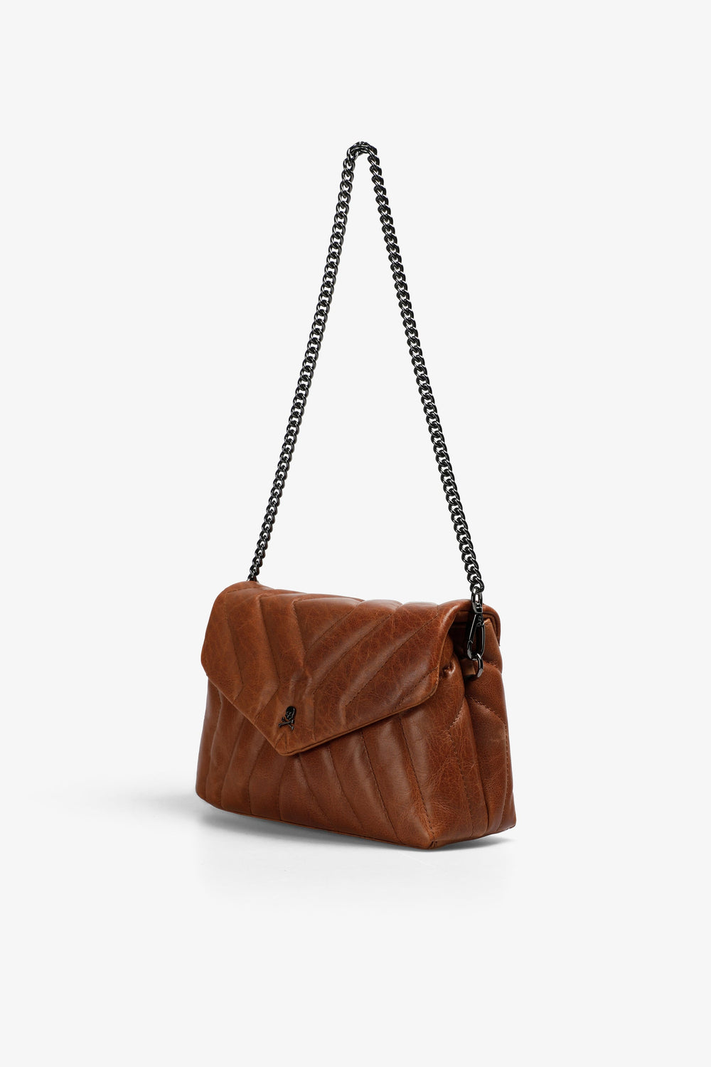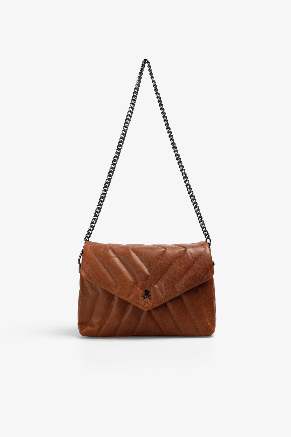 Mini bag made of quilted 100% leather. Magnetic fastening with a flap, chain strap or adjustable leather handle and inner compartments. Metallic skull on the front.