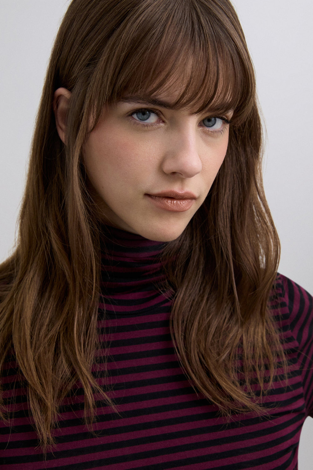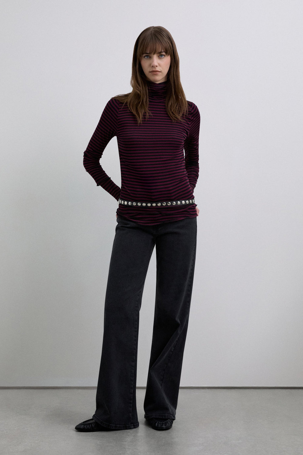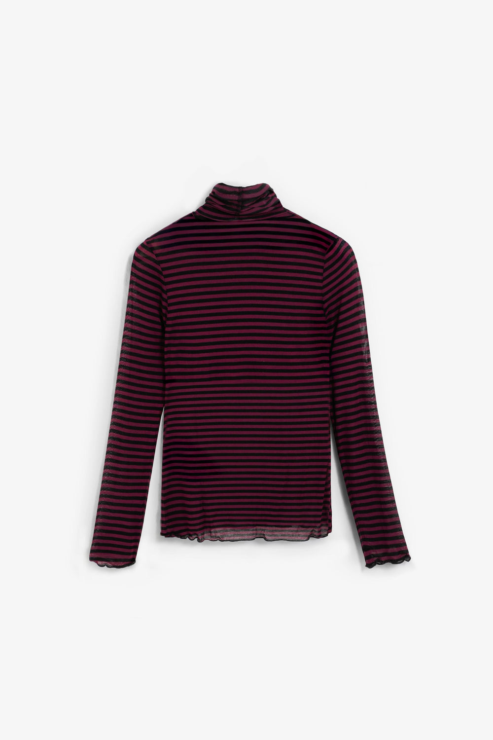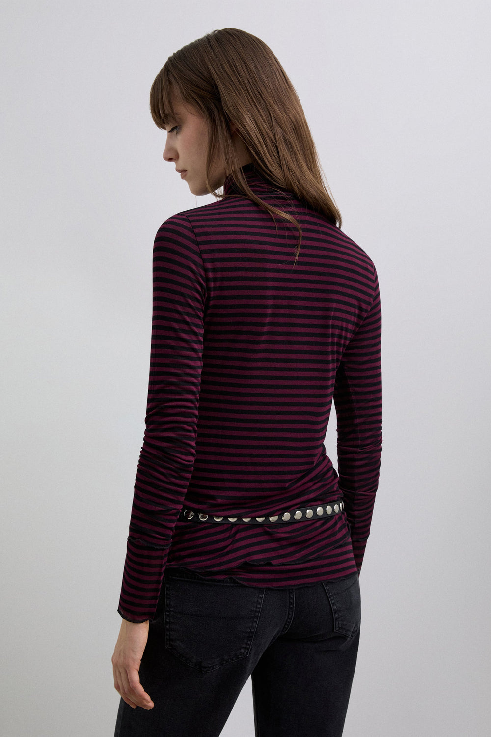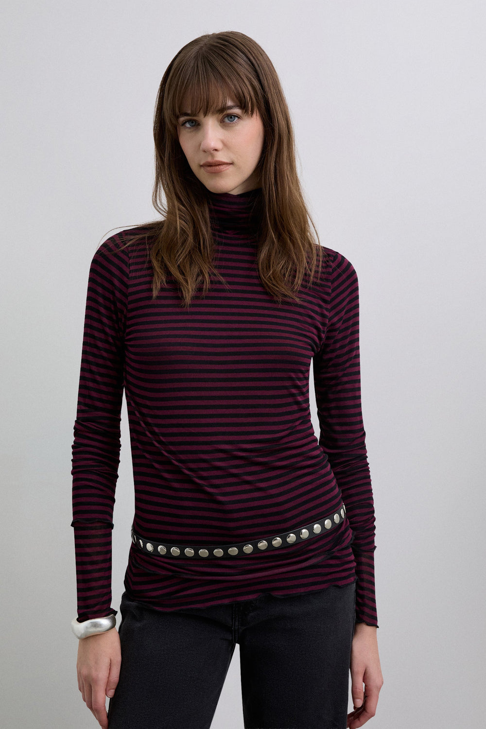 T-shirt à rayures à manches longues. Col tortue orné de surfils. Motif rayé. Tissu semi-transparent.
