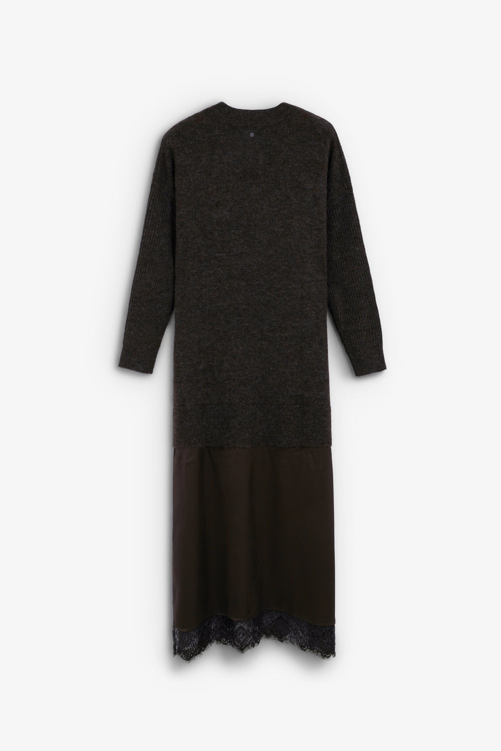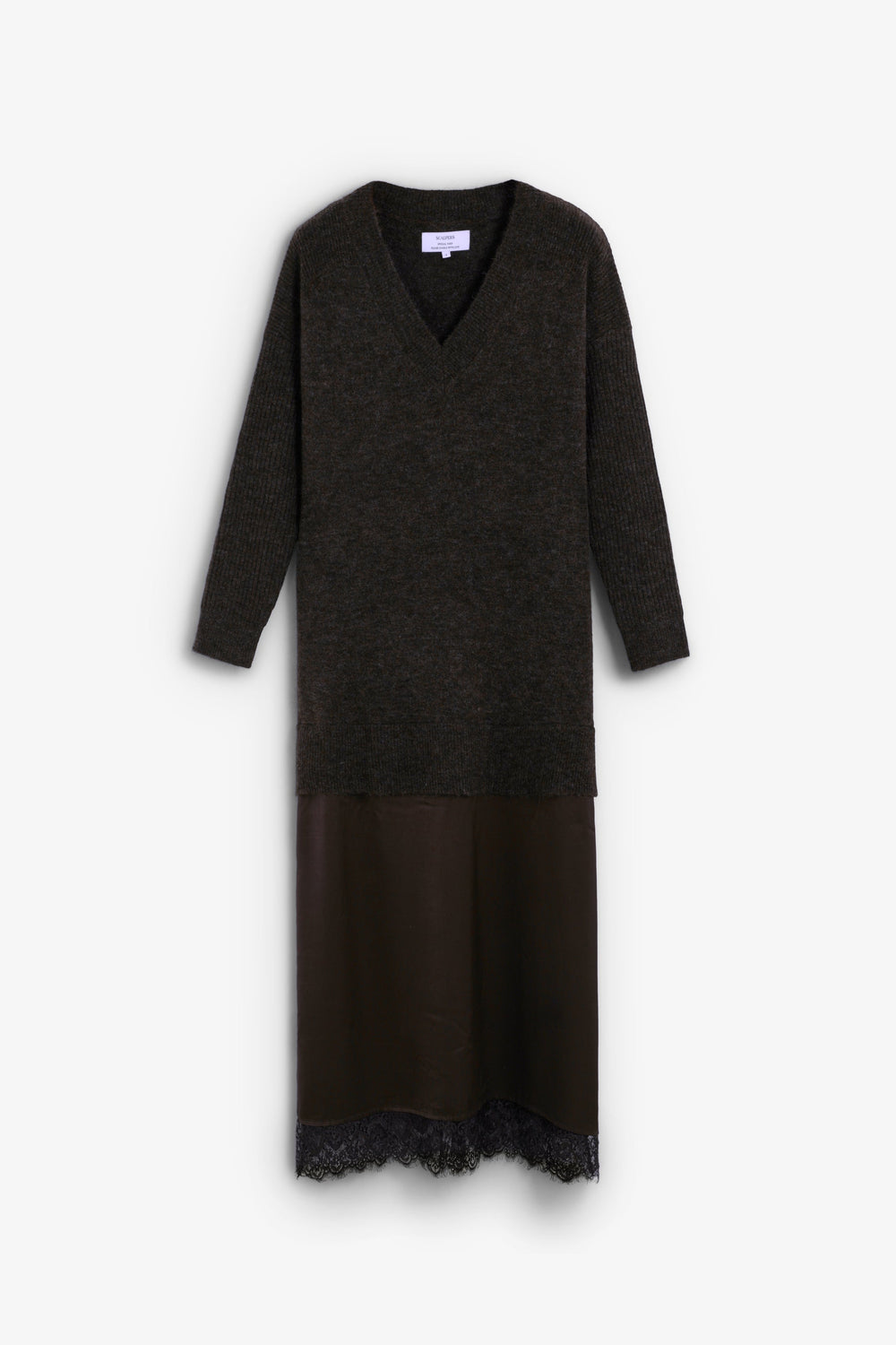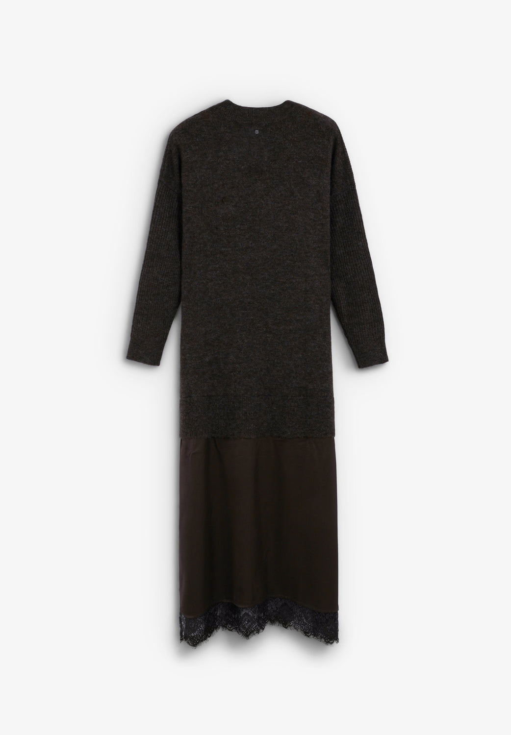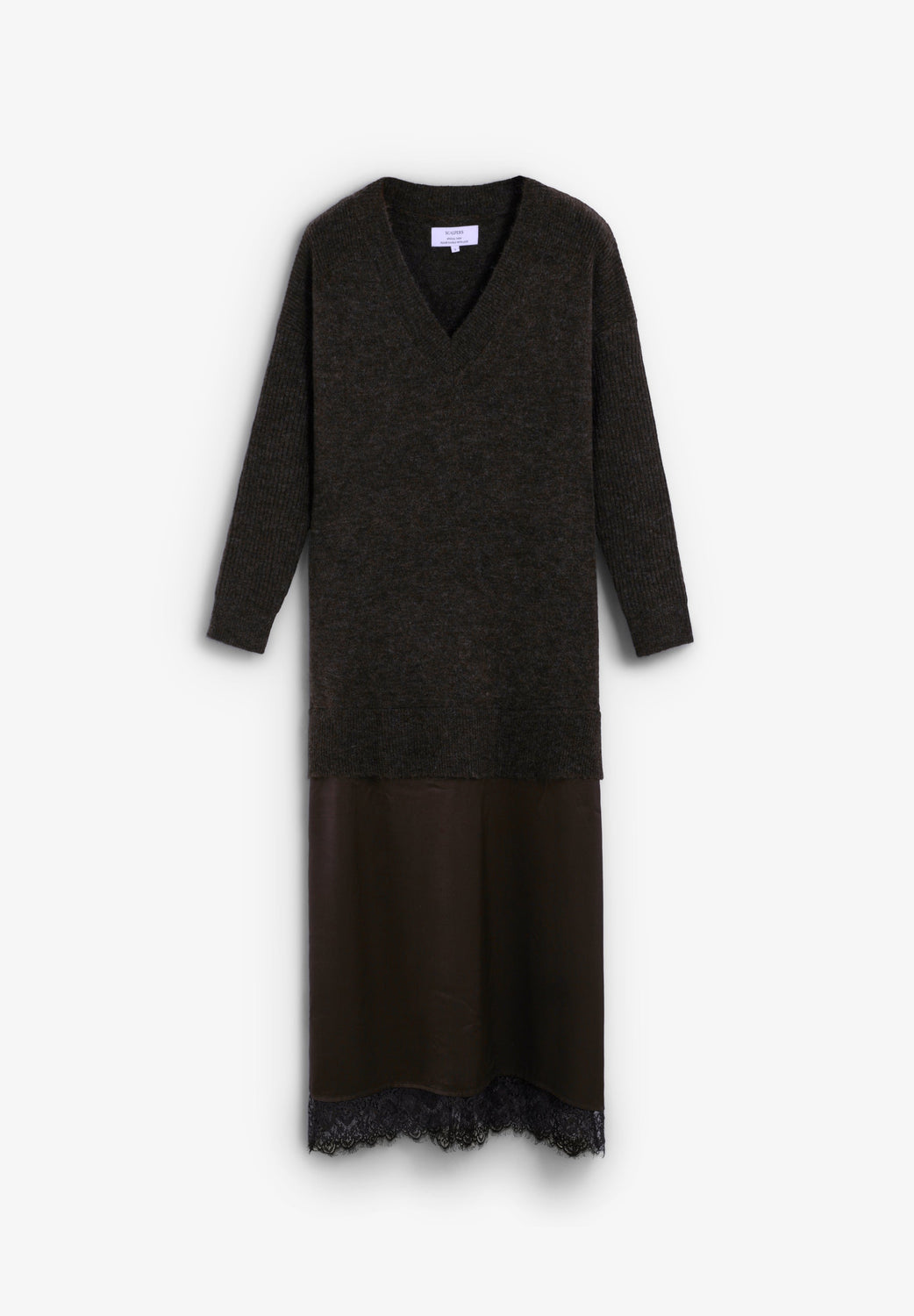 Robe confectionnée dans un mélange de laine et de viscose. Robe midi à décolleté en V et manches longues. Finition en bord-côte à l’encolure, aux poignets et dans le bas avec des détails de nuisette marron et noire.