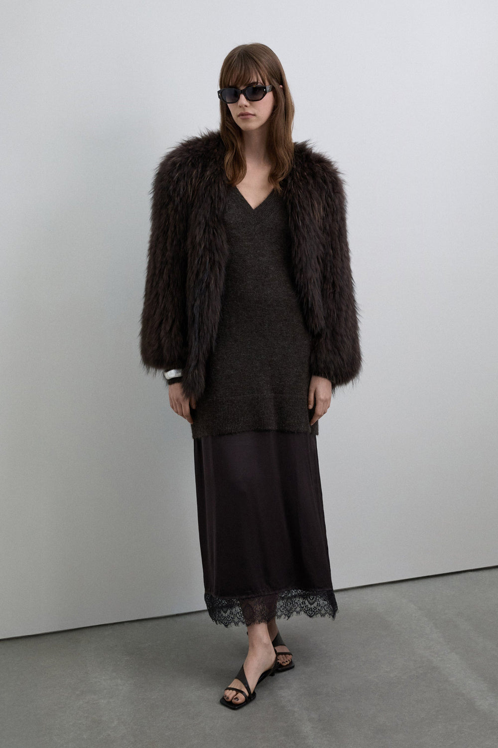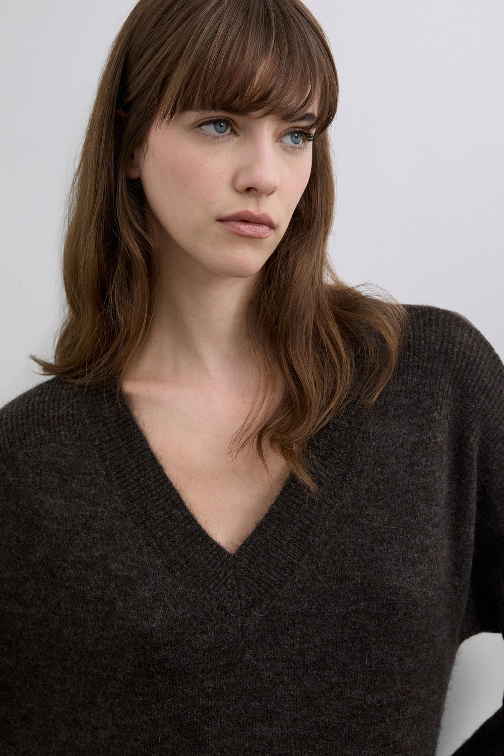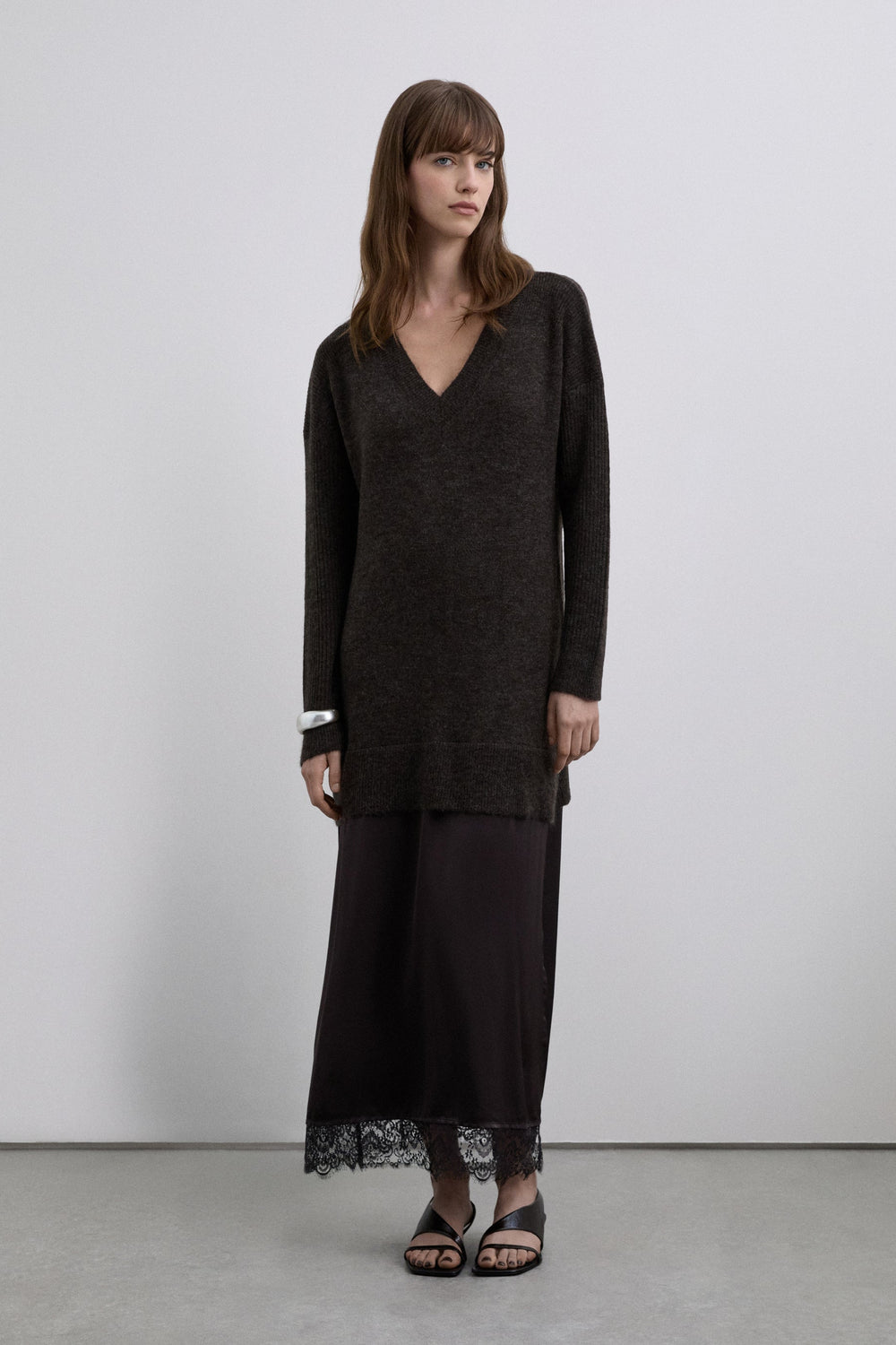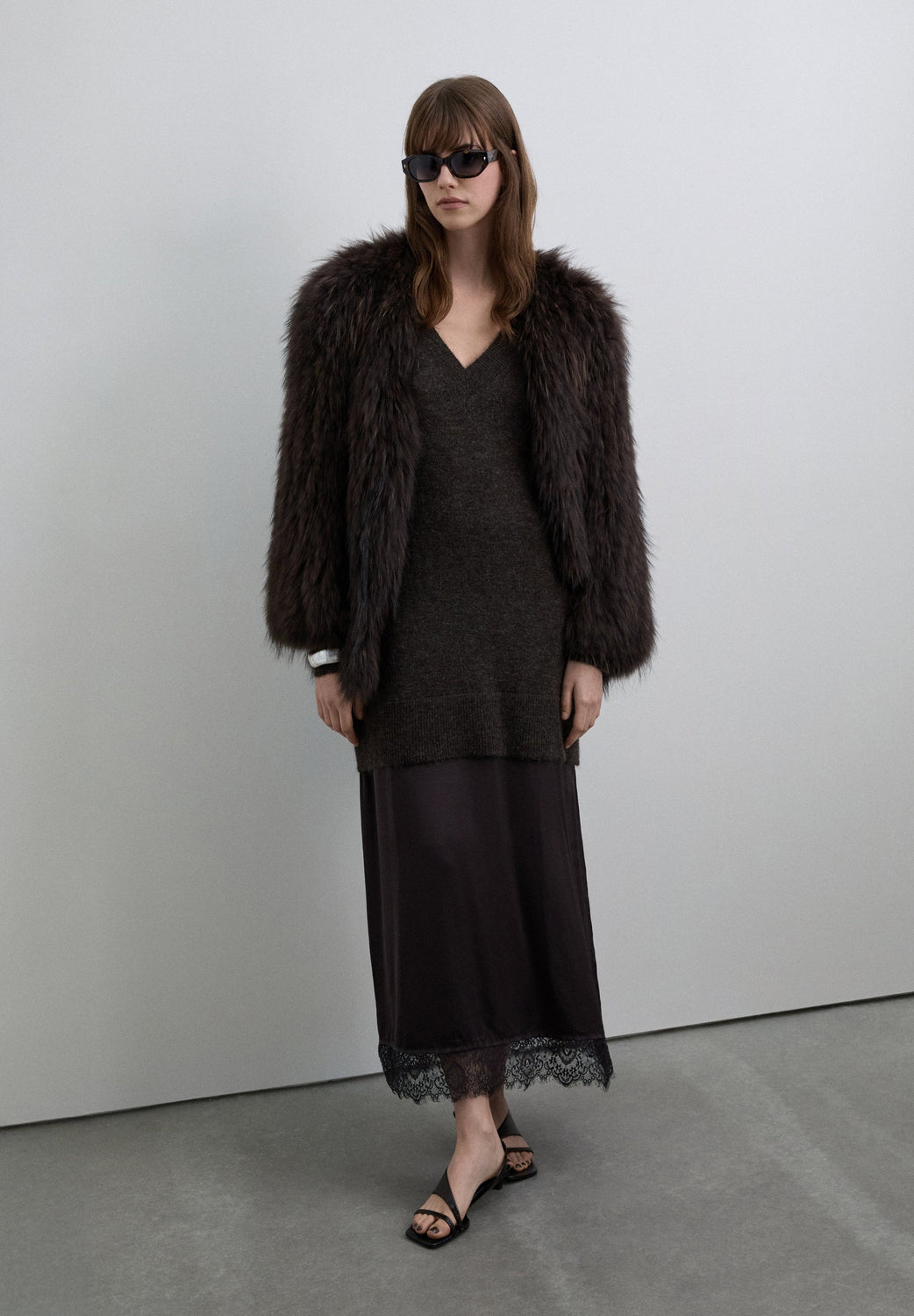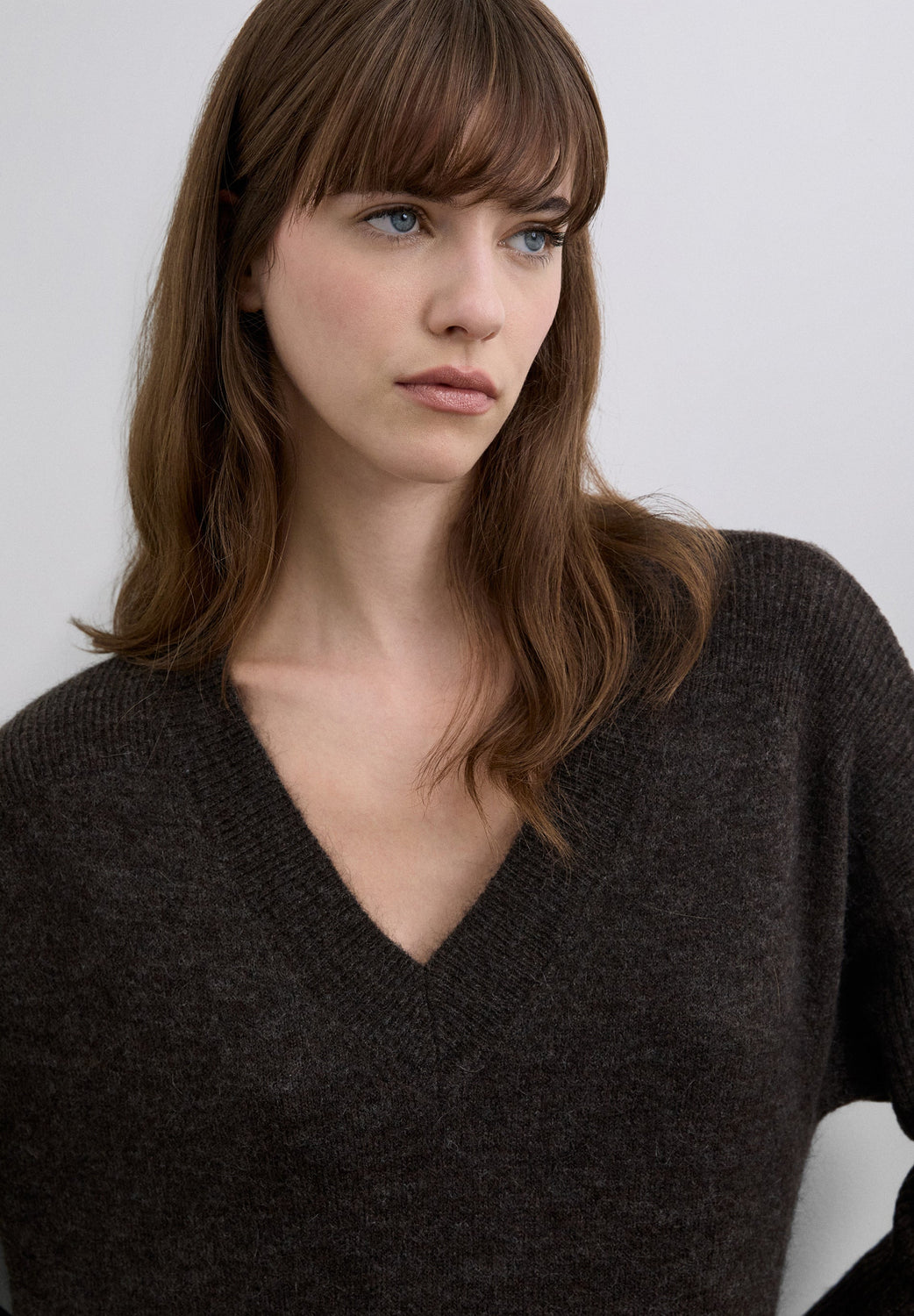 Robe confectionnée dans un mélange de laine et de viscose. Robe midi à décolleté en V et manches longues. Finition en bord-côte à l’encolure, aux poignets et dans le bas avec des détails de nuisette marron et noire.