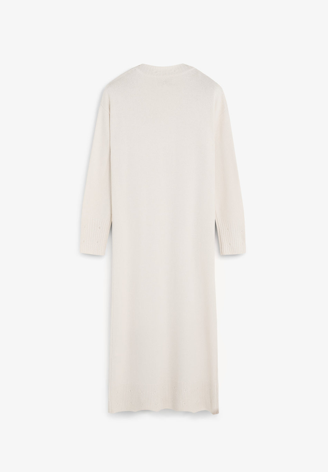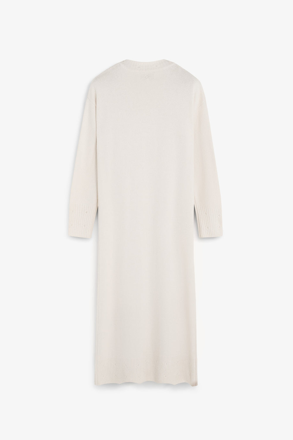 Robe ample longueur midi à décolleté en V et manches longues. Points fantaisie sur l’encolure, les poignets et le bas. Petits trous dans le bas.