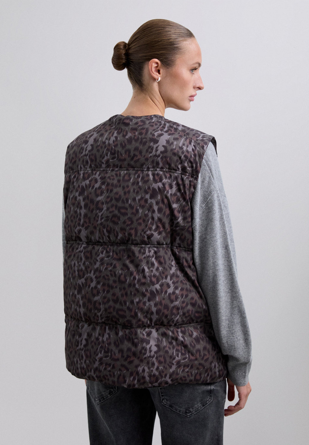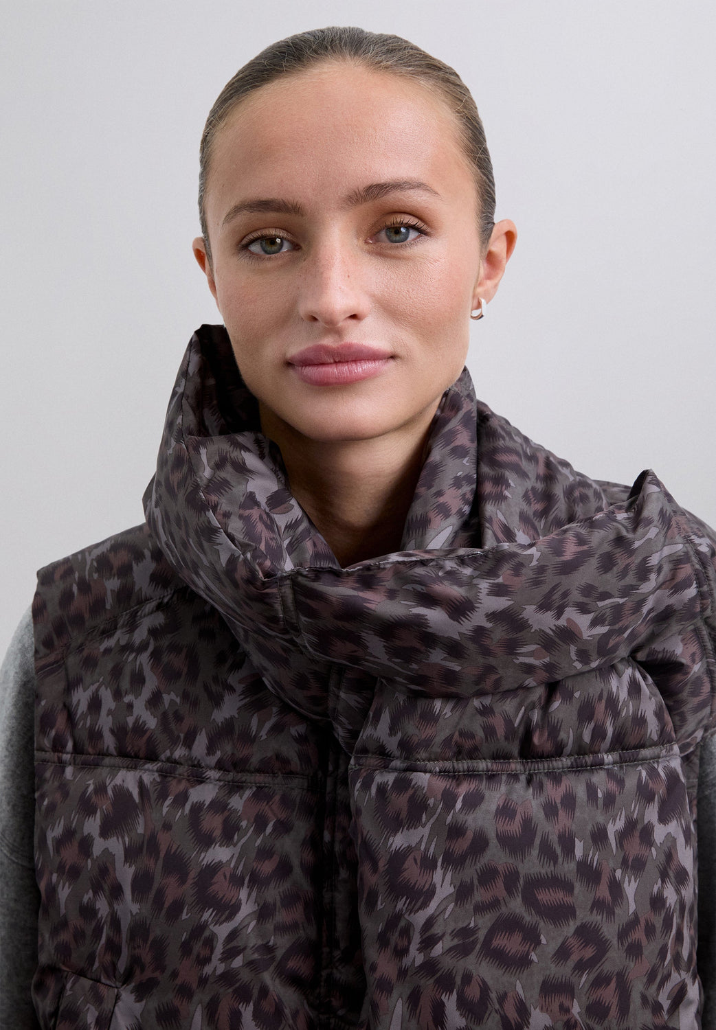 Gilet sans manches matelassé motif animal. Fermeture éclair cachée et boutons-pression. Coupe ample. Écharpe matelassée amovible. Cordon de serrage dans le bas. Deux poches sur le devant.
