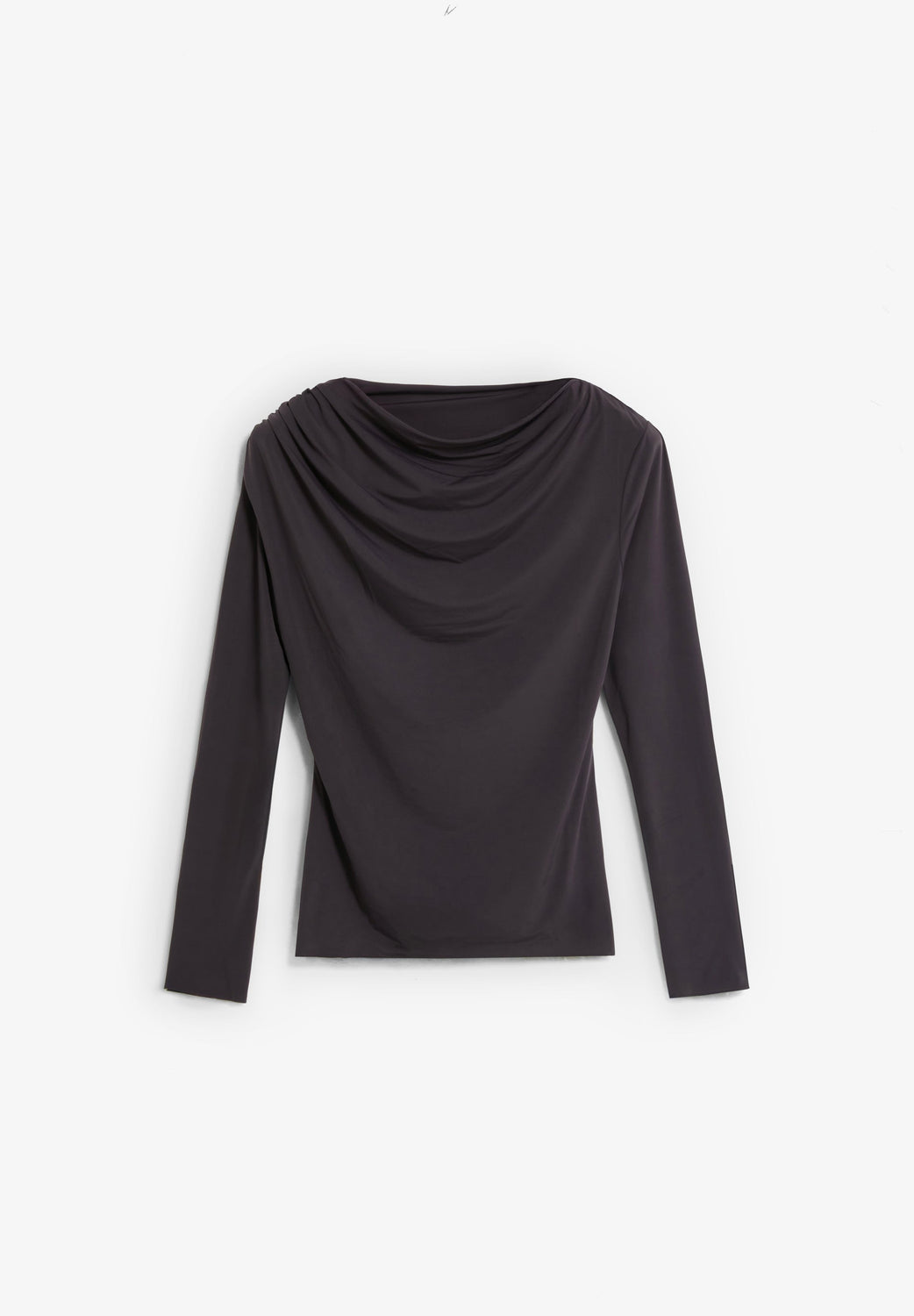T-shirt à manches longues et à col drapé. Plis sur une épaule. Taille serrée.
