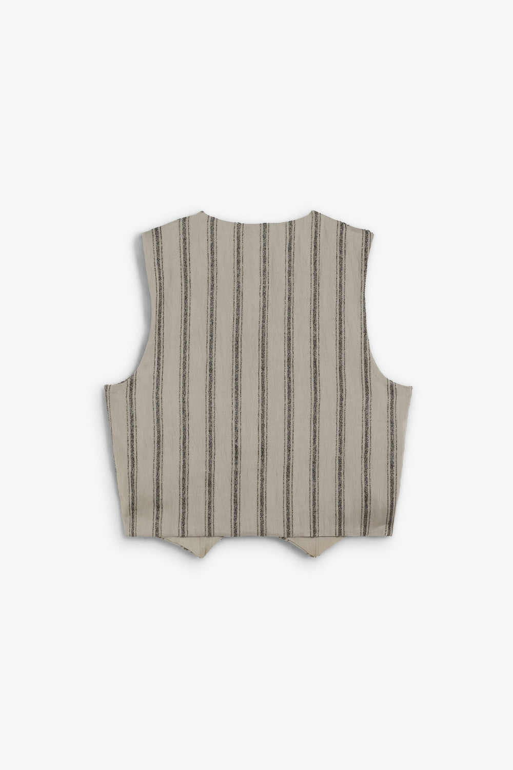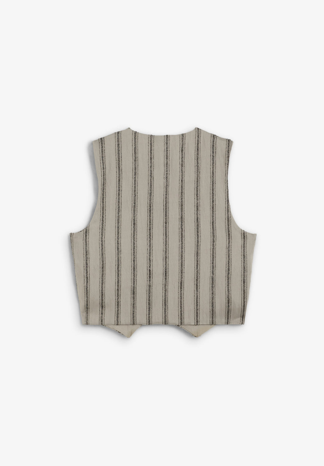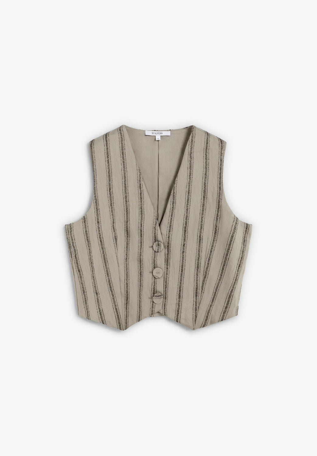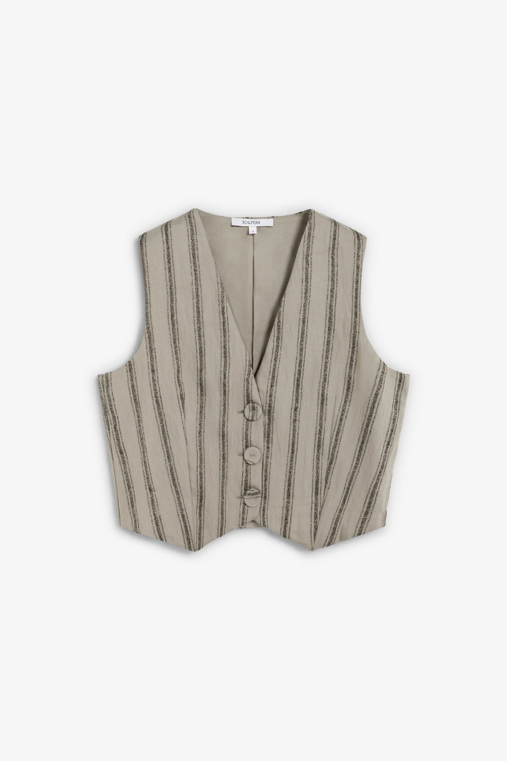 Veste sans manches à rayures avec détails en fil métallisé. Confectionnée en tissu fluide. Coupe droite. Fermeture boutonnée. Col en v. Emmanchures américaines.