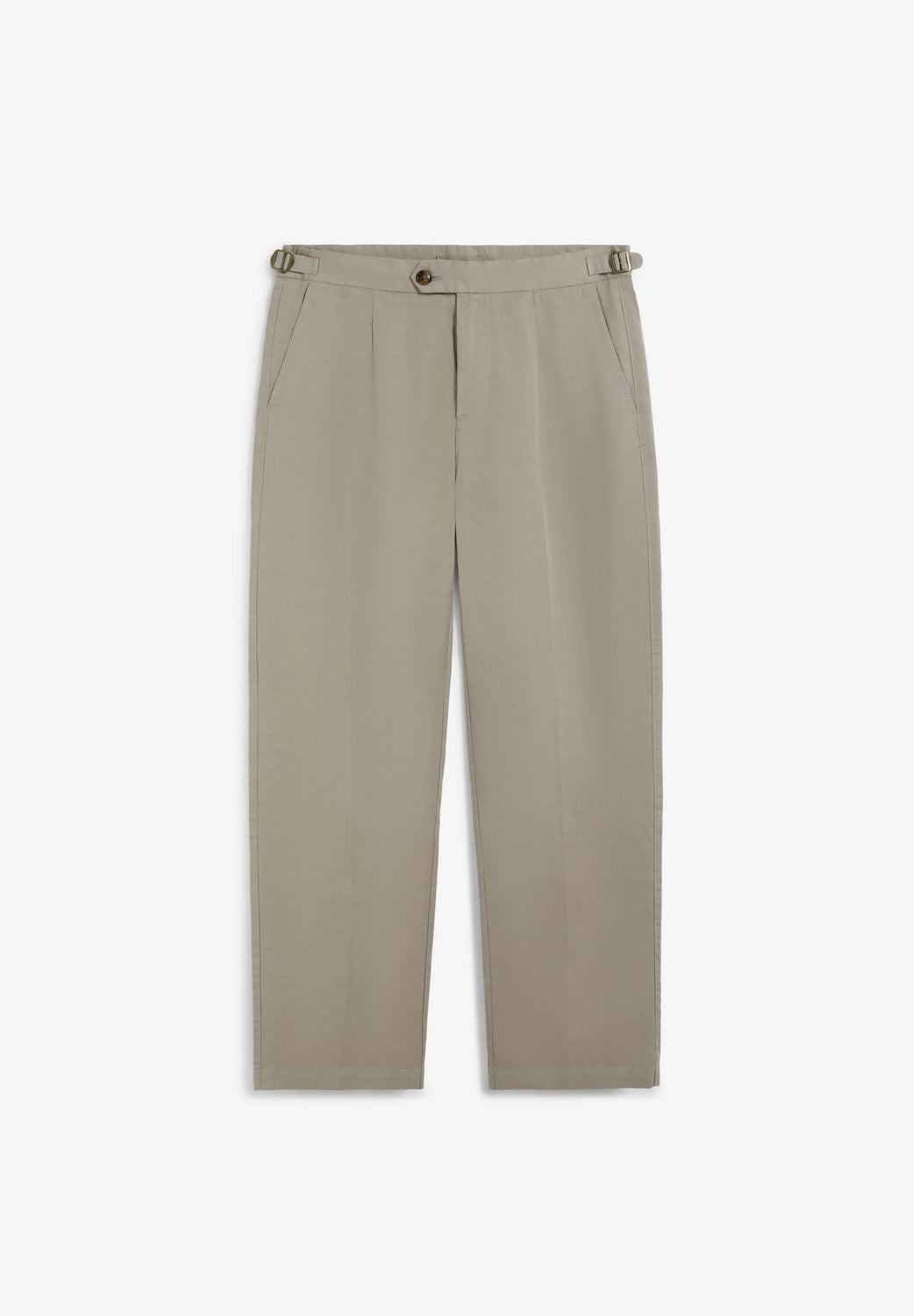 Pantalon en coton et lin mélangés. Coupe slim. Pinces sur le devant. Détail réglable à la taille. Fermeture Éclair et bouton légèrement décalé.
