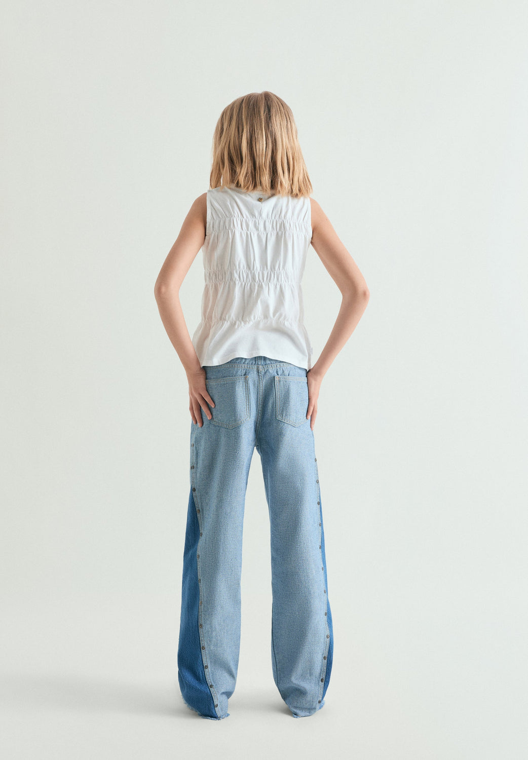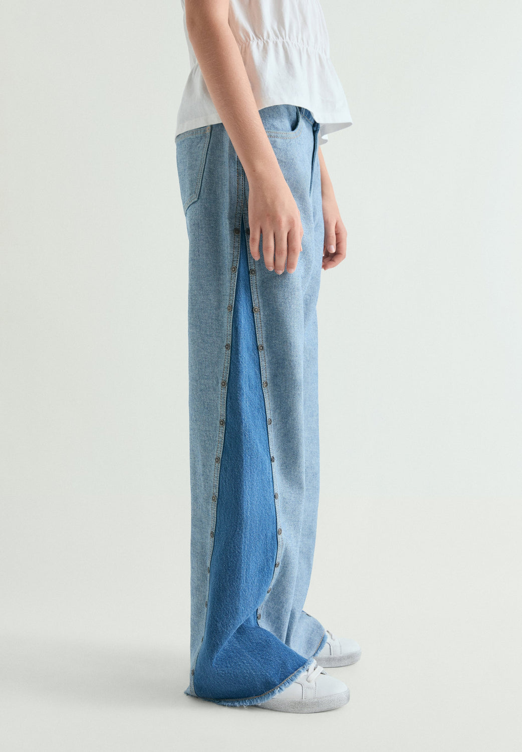 Jean wide leg à taille moyenne 100 % coton. Modèle bicolore contrastant. Bouton et fermeture Éclair sur le devant. Poches à l’avant et à l’arrière. Bas évasé effiloché. Fentes avec clous sur le côté.
