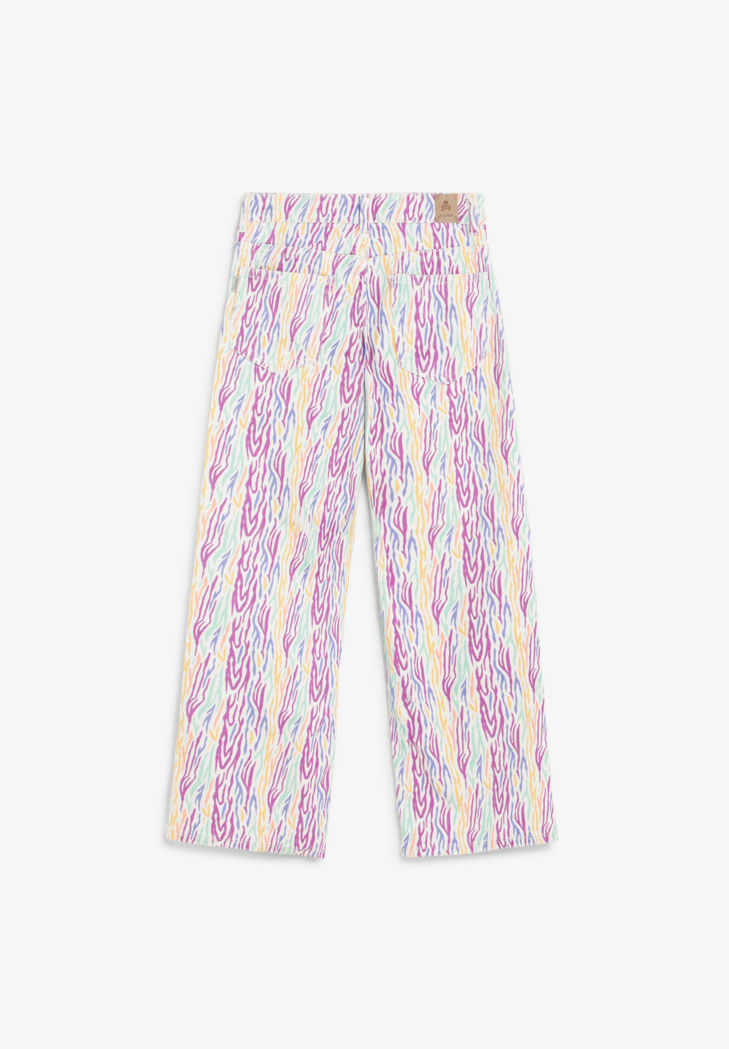Pantalon denim wide leg confectionné en coton légèrement extensible. Imprimé multicolore. Bouton et fermeture Éclair sur le devant. Poches à l’avant et à l’arrière.