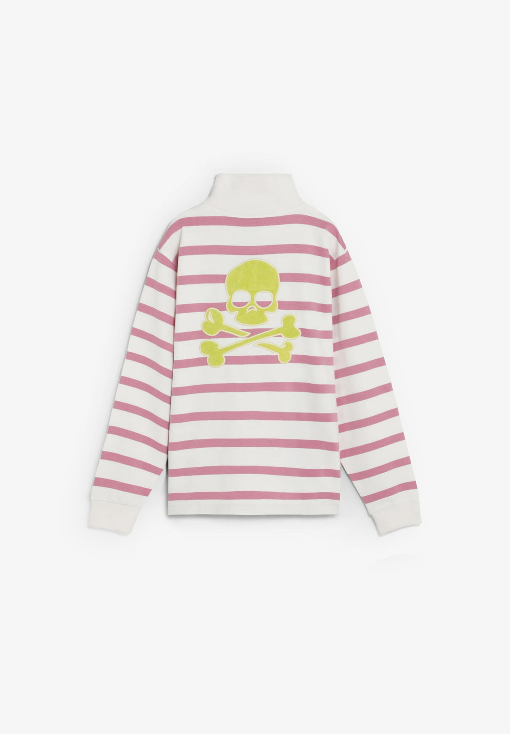 Sweat 100 % coton BCI. Manches longues. Col montant avec fermeture Éclair contrastante. Poches kangourou devant. Imprimé rayé. Logo brodé dans le dos. Logo sur la poitrine. Finitions côtelées.