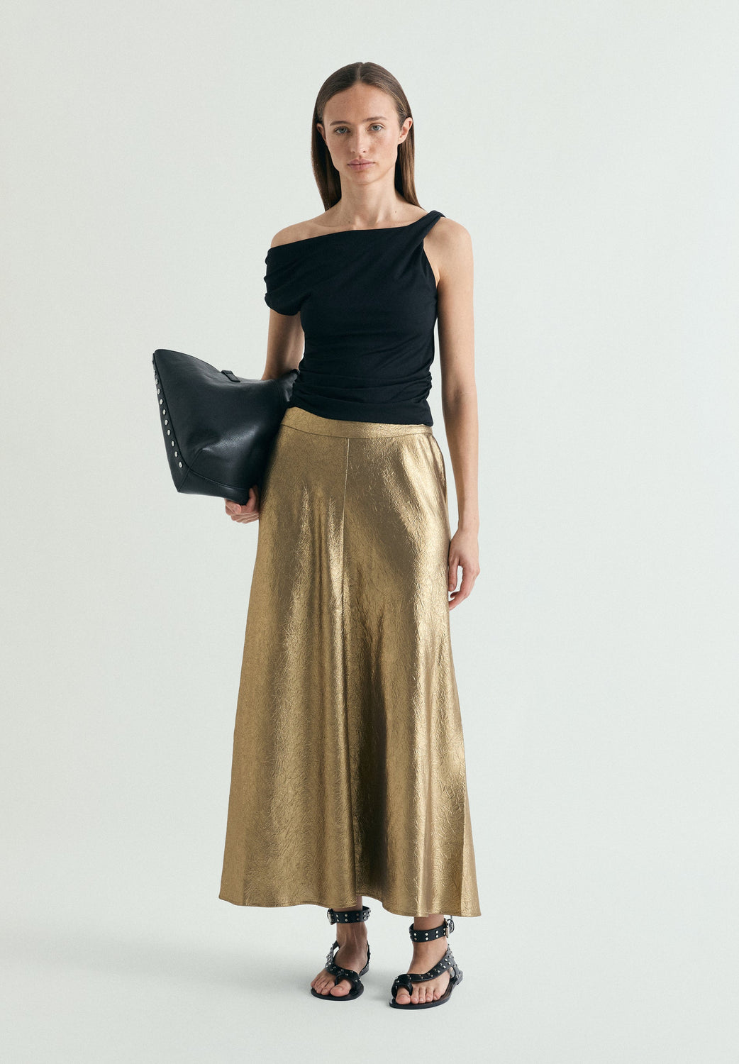 Jupe confectionnée dans un tissu fluide métallisé texturé. Coupe droite longueur midi. Couture centrale et arrière. Fermeture Éclair dissimulée à l’arrière. Élastique au niveau de la taille dans le dos.