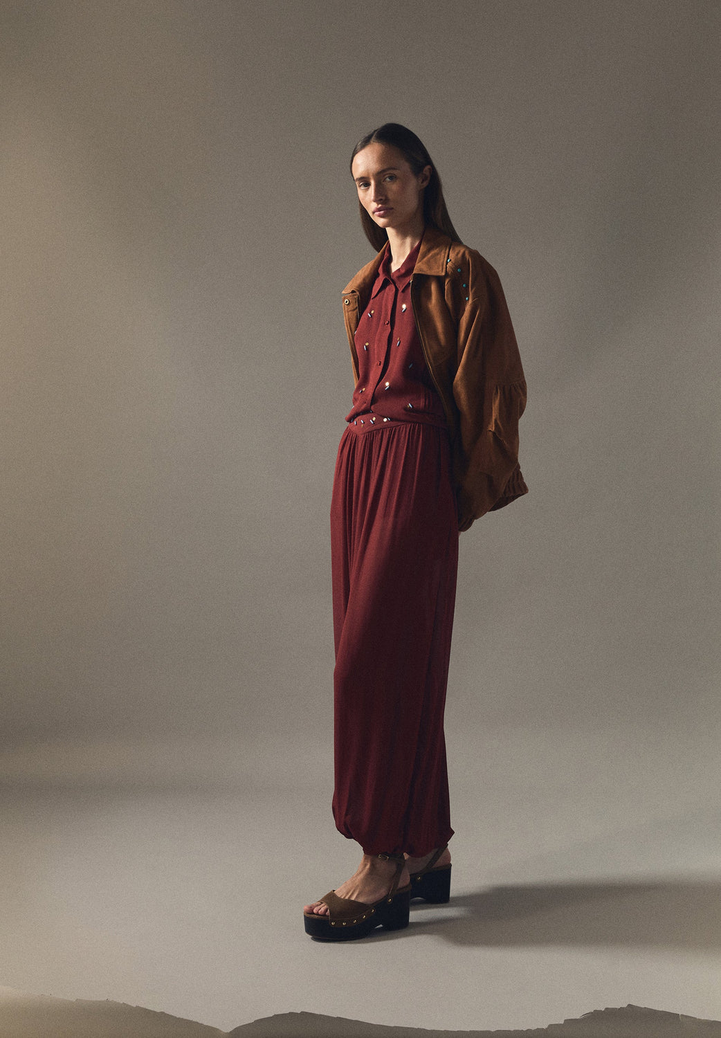 Pantalon baggy en tissu fluide avec détails appliqués à la taille et liens ajustables à la cheville. Coupe droite, taille avec élastique à l’arrière.