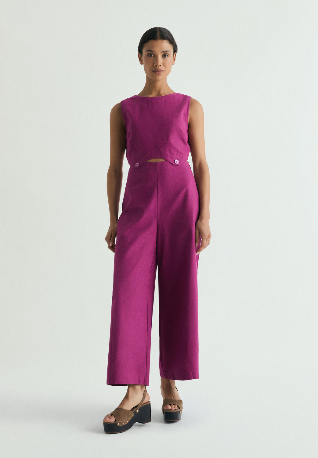 Combinaison en lin. Coupe droite. Col rond et emmanchures américaines. Fentes à la taille intégrées au pantalon avec boutons ton sur ton. Dos en V et fermeture boutonnée.
