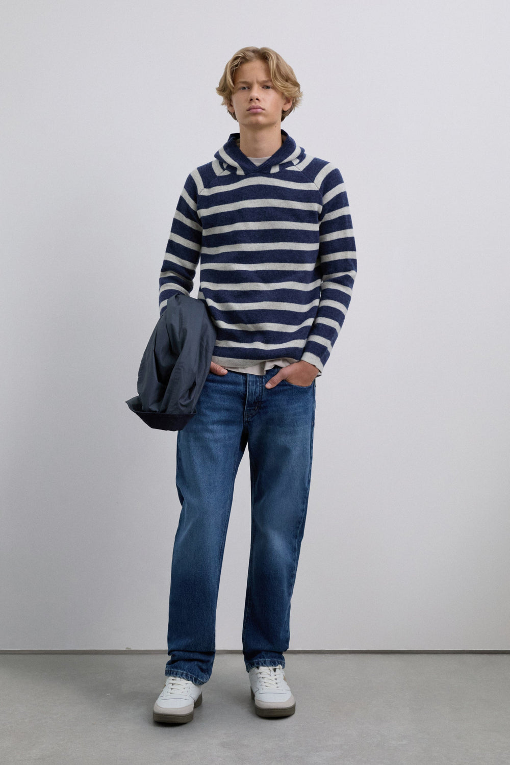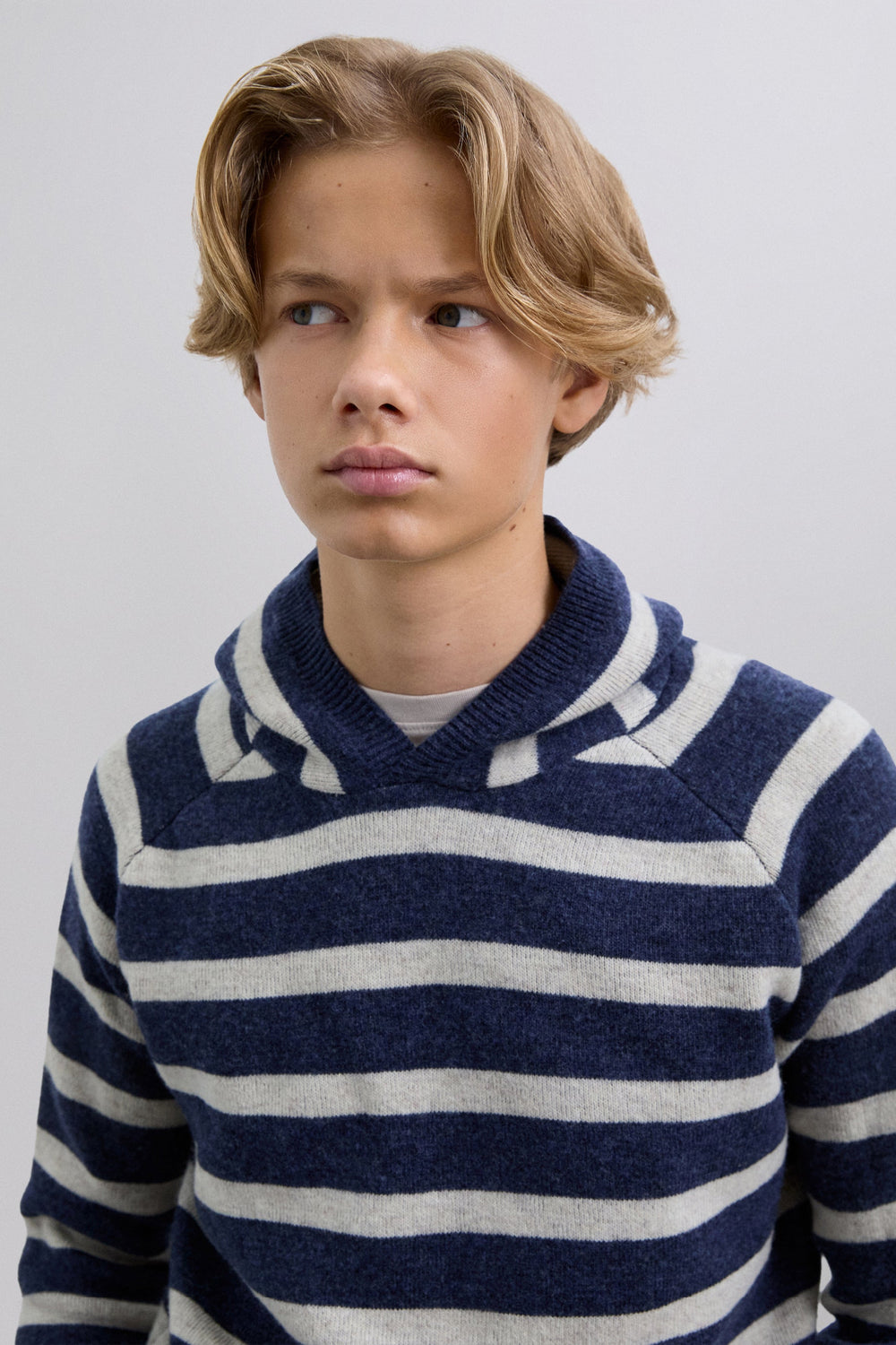 Pull en maille à capuche confectionné dans un mélange de laine. Imprimé rayé. Manches longues. Skull contrastant brodé dans le bas.
