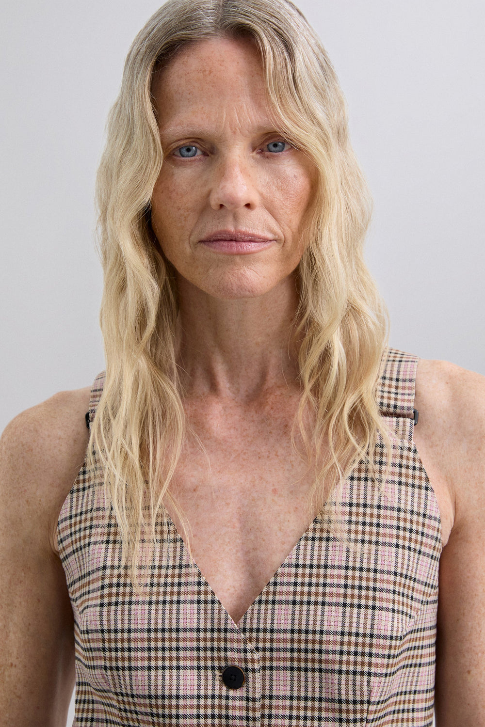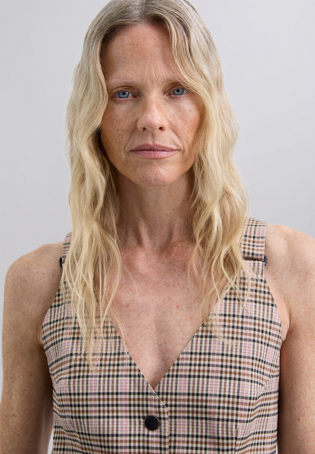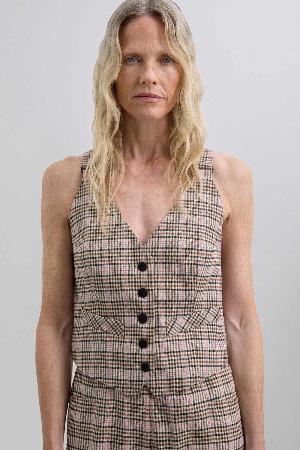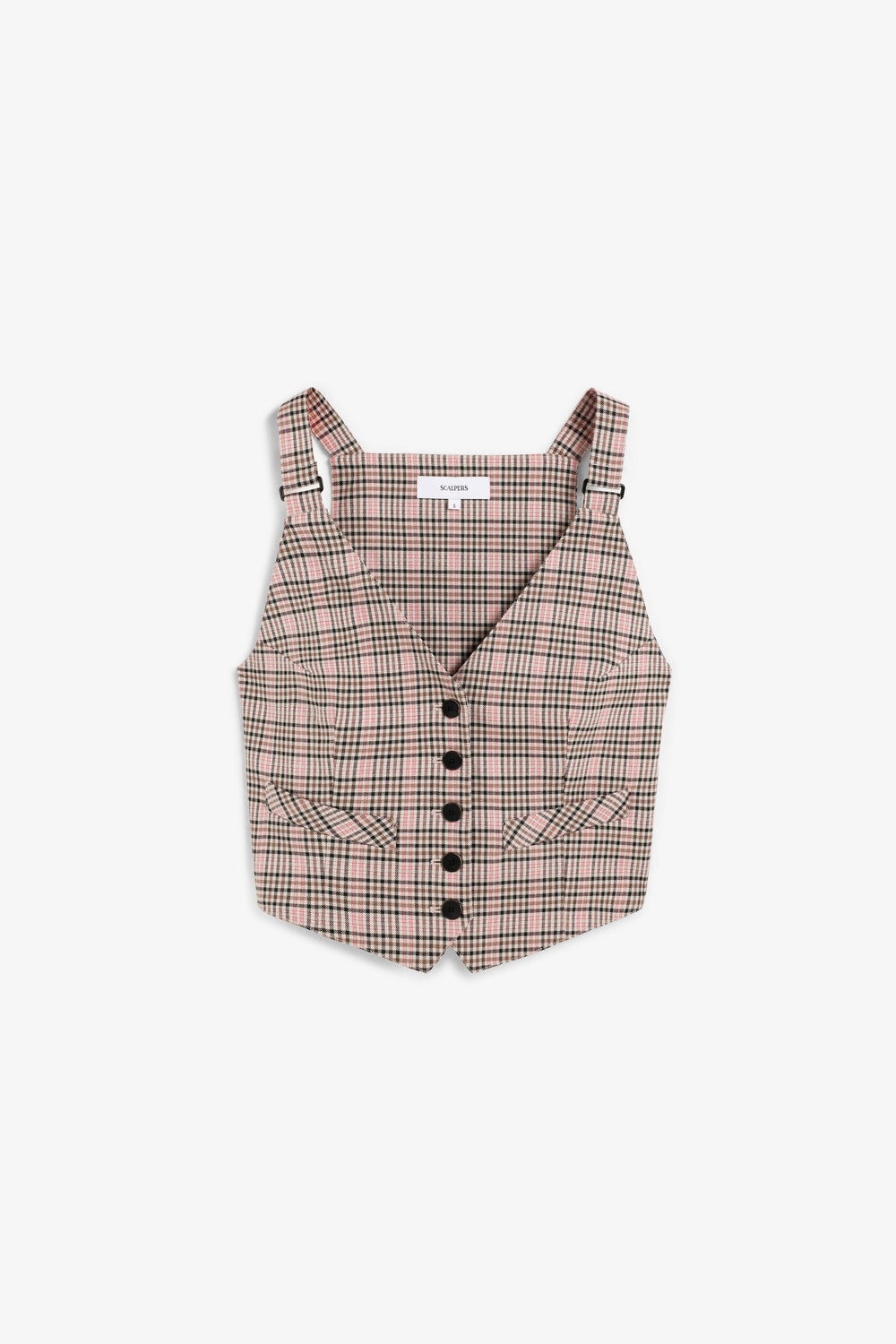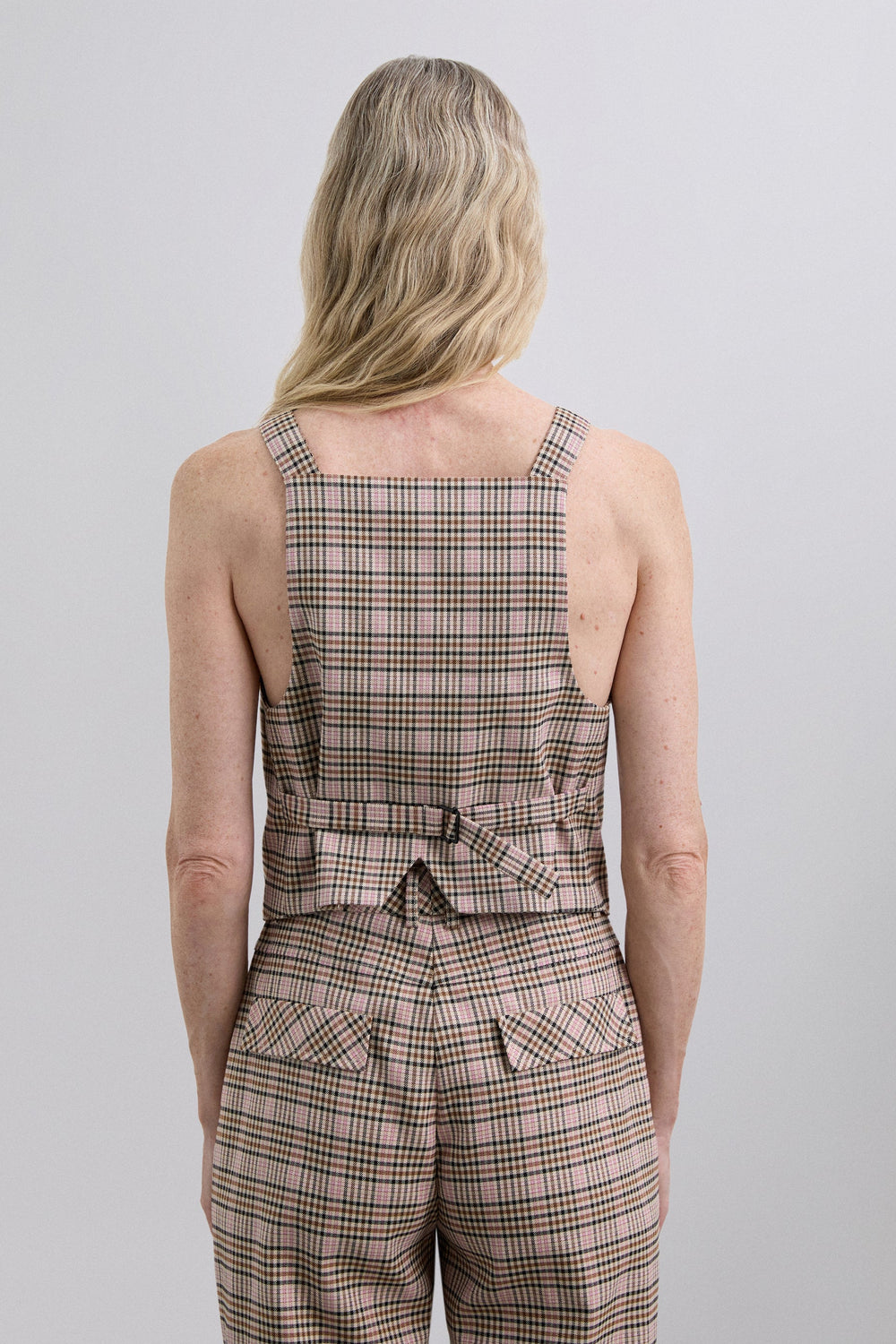 Gilet à carreaux. Décolleté en V. Bretelles ajustables. Fermeture boutonnée sur le devant. Deux poches sur le devant.