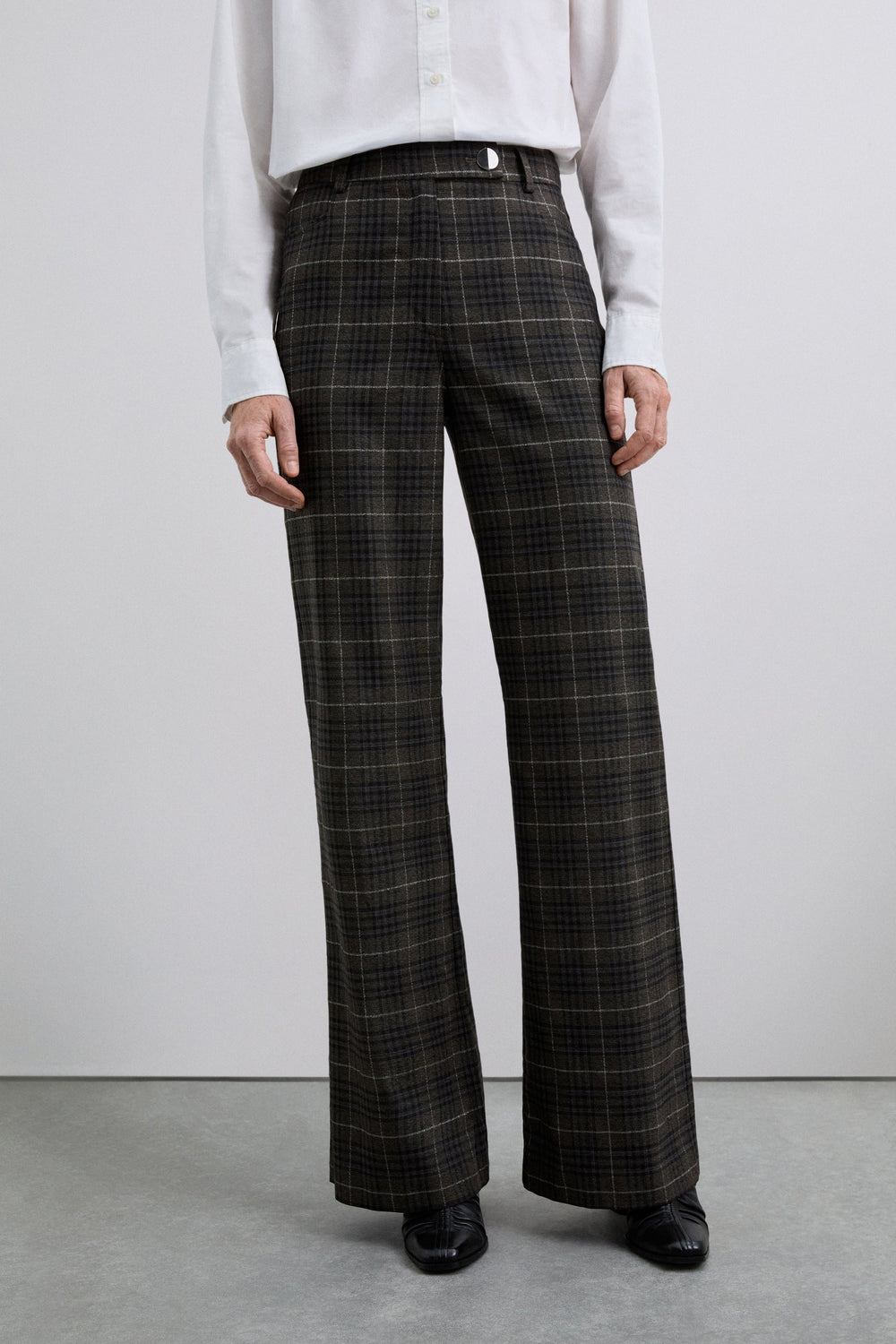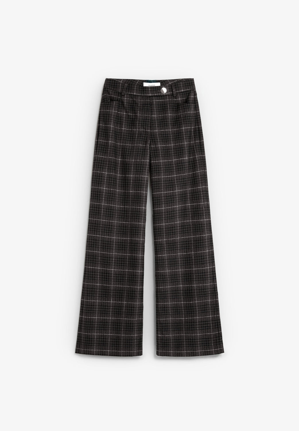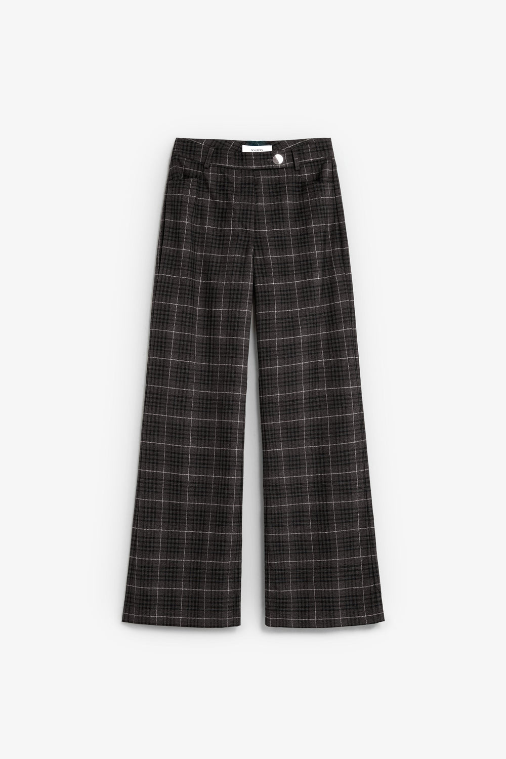 Pantalon coupe droite. Fermeture éclair devant et bouton. Deux poches à rabat à l’arrière. Passants de ceinture. À carreaux.