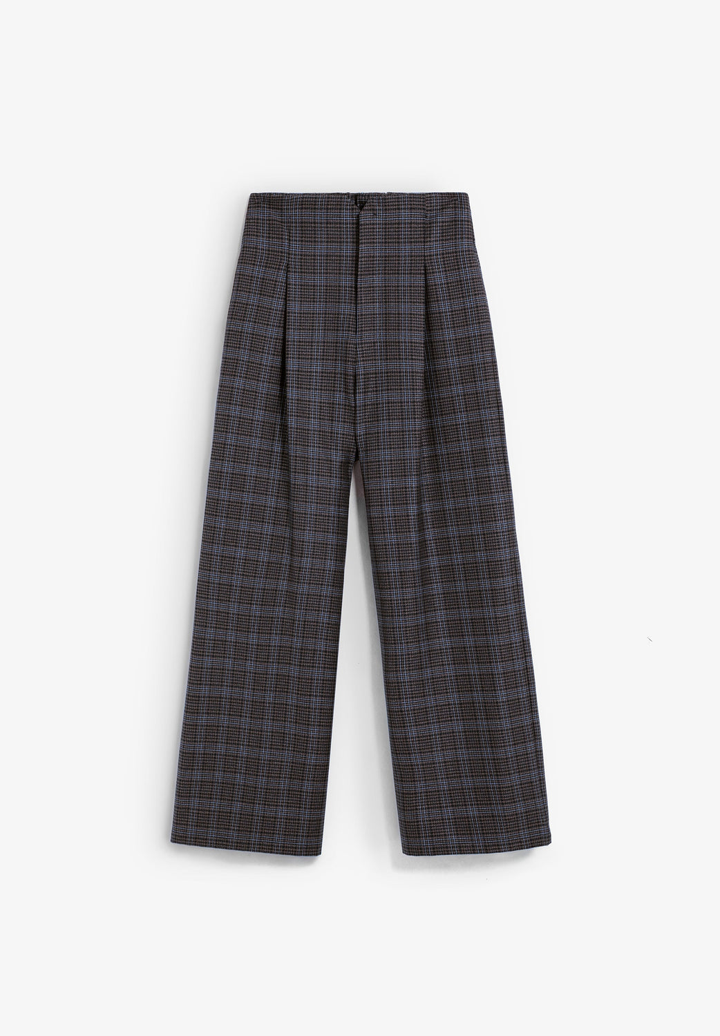 Jupe-culotte. Pli sur le devant. Fermeture éclair invisible et bouton. À carreaux.