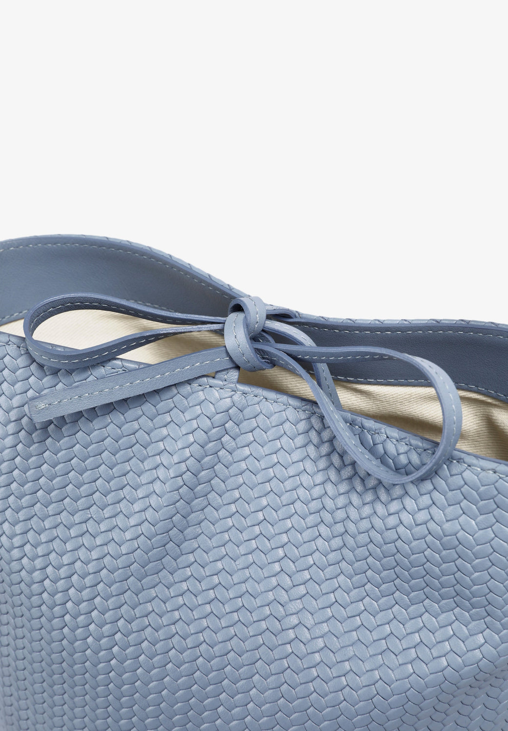 Sac seau 100 % cuir tressé. Doublure avec poche à fermeture Éclair. Fermeture par des liens à nouer. Bandoulière. Logo en métal devant.