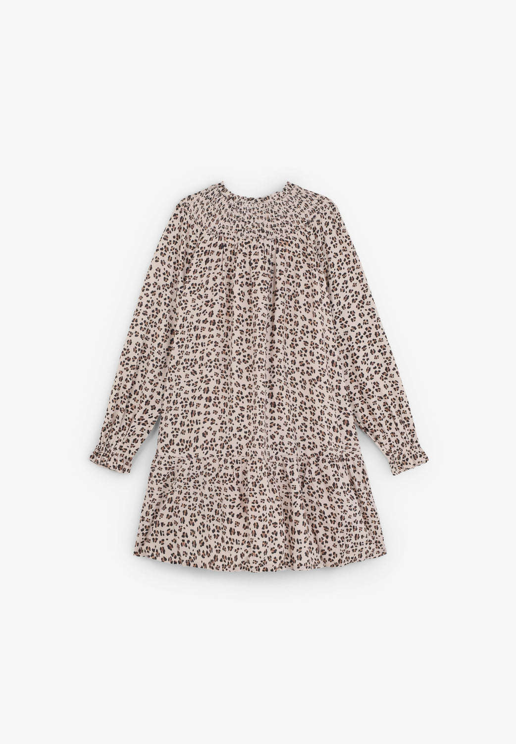Robe imprimée motif animal. Manches longues légèrement bouffantes. Col nid d’abeille et boutons dans le dos.