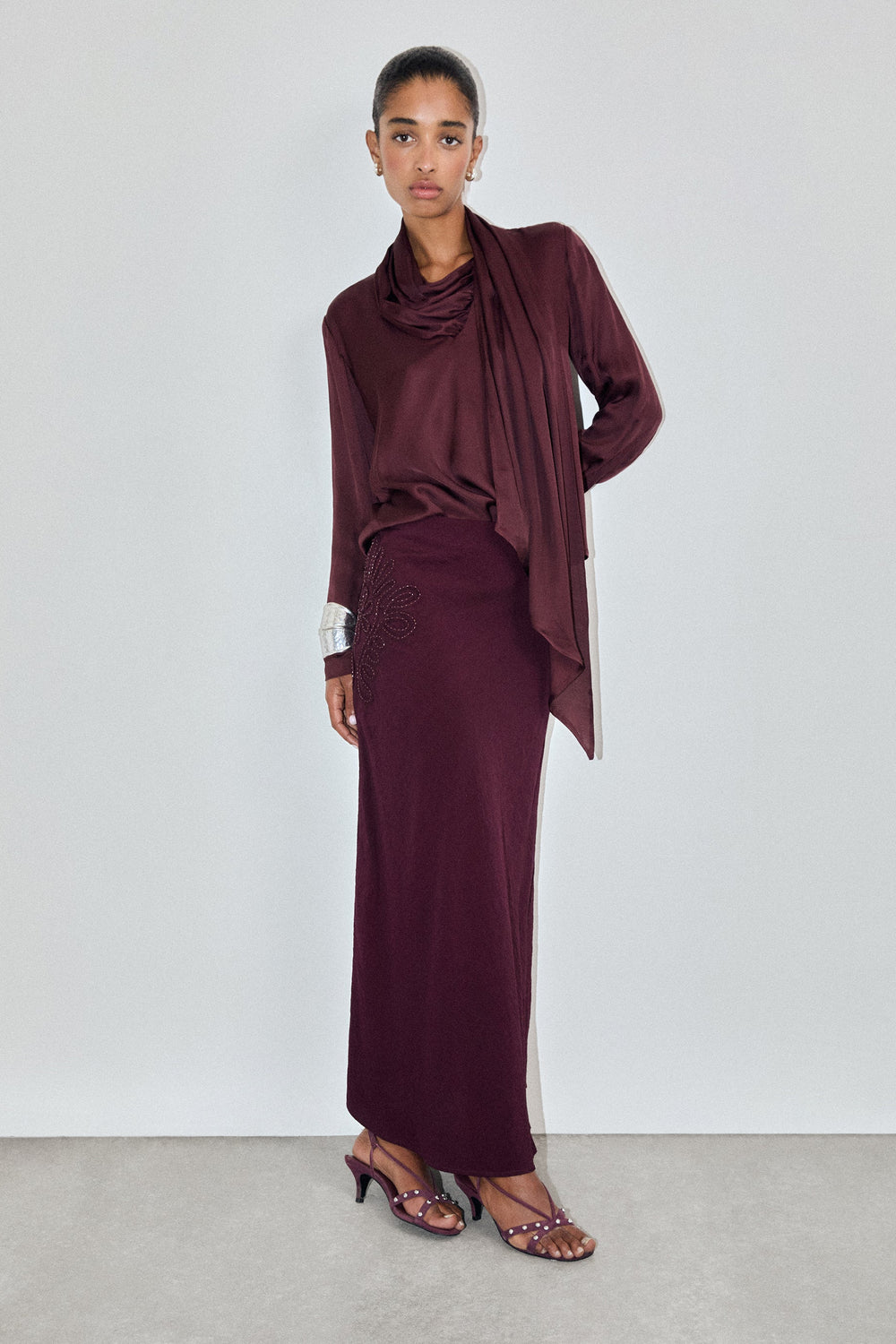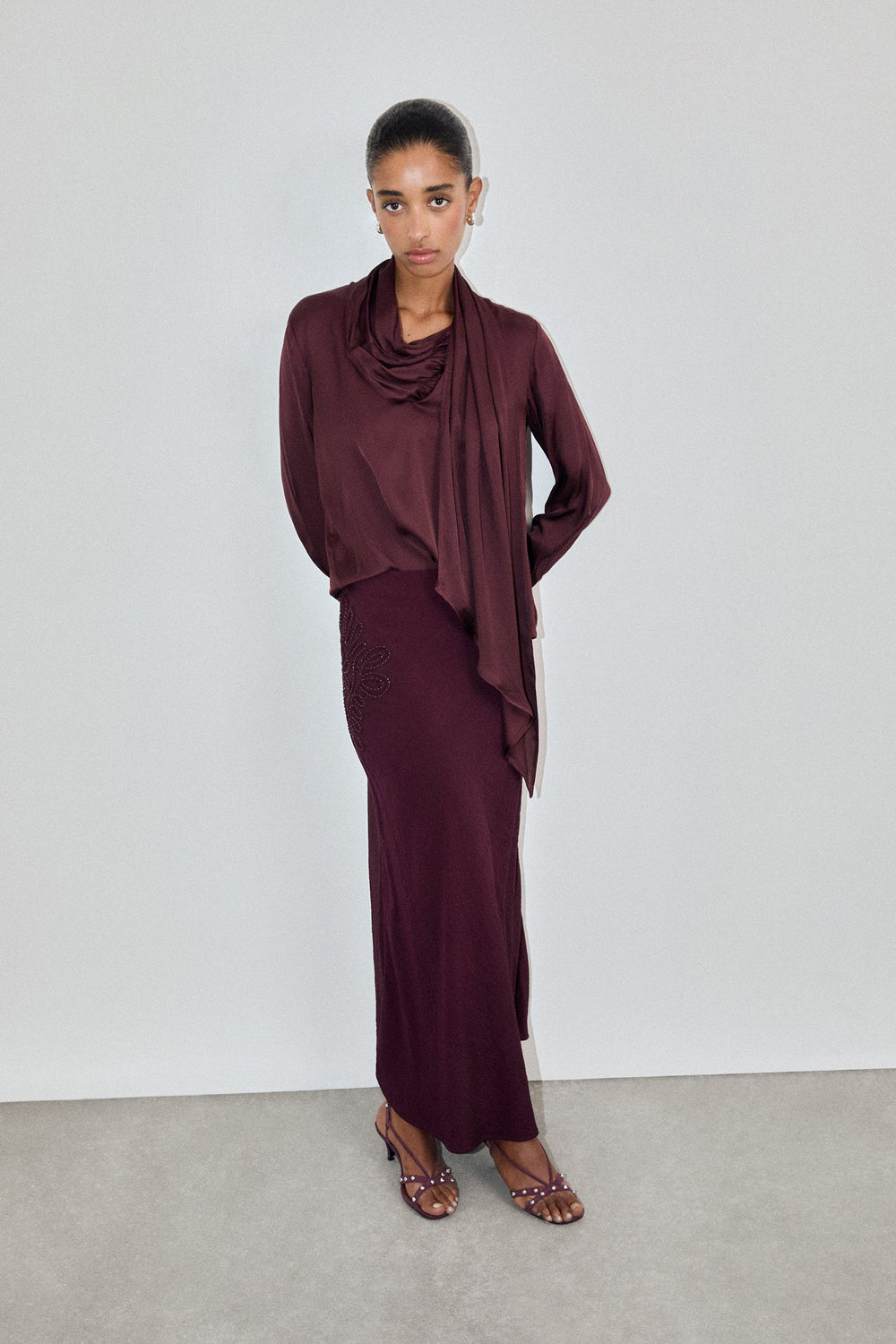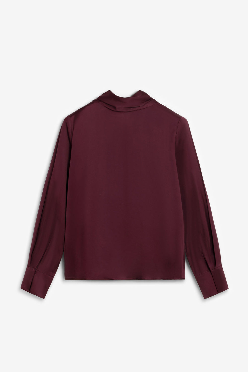 Satin blouse with long sleeves. Draped collar and adjustable bow.