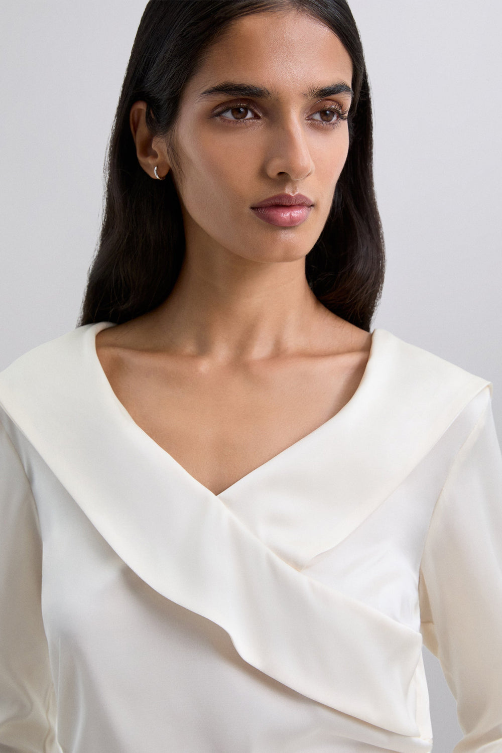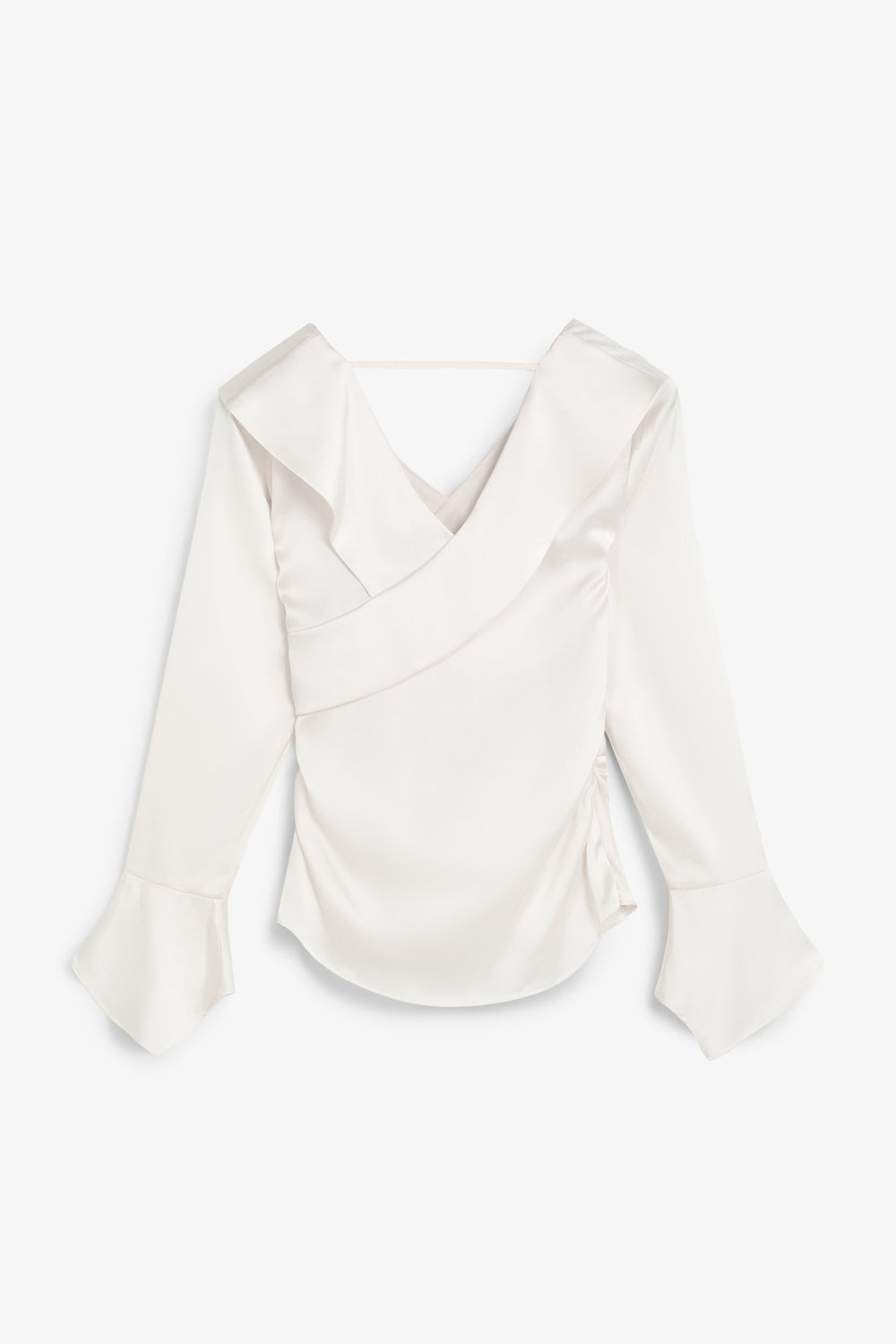 Asymmetric blouse with long sleeves and ruffle trim. Gathered waist and V-neck with ruffle detail.