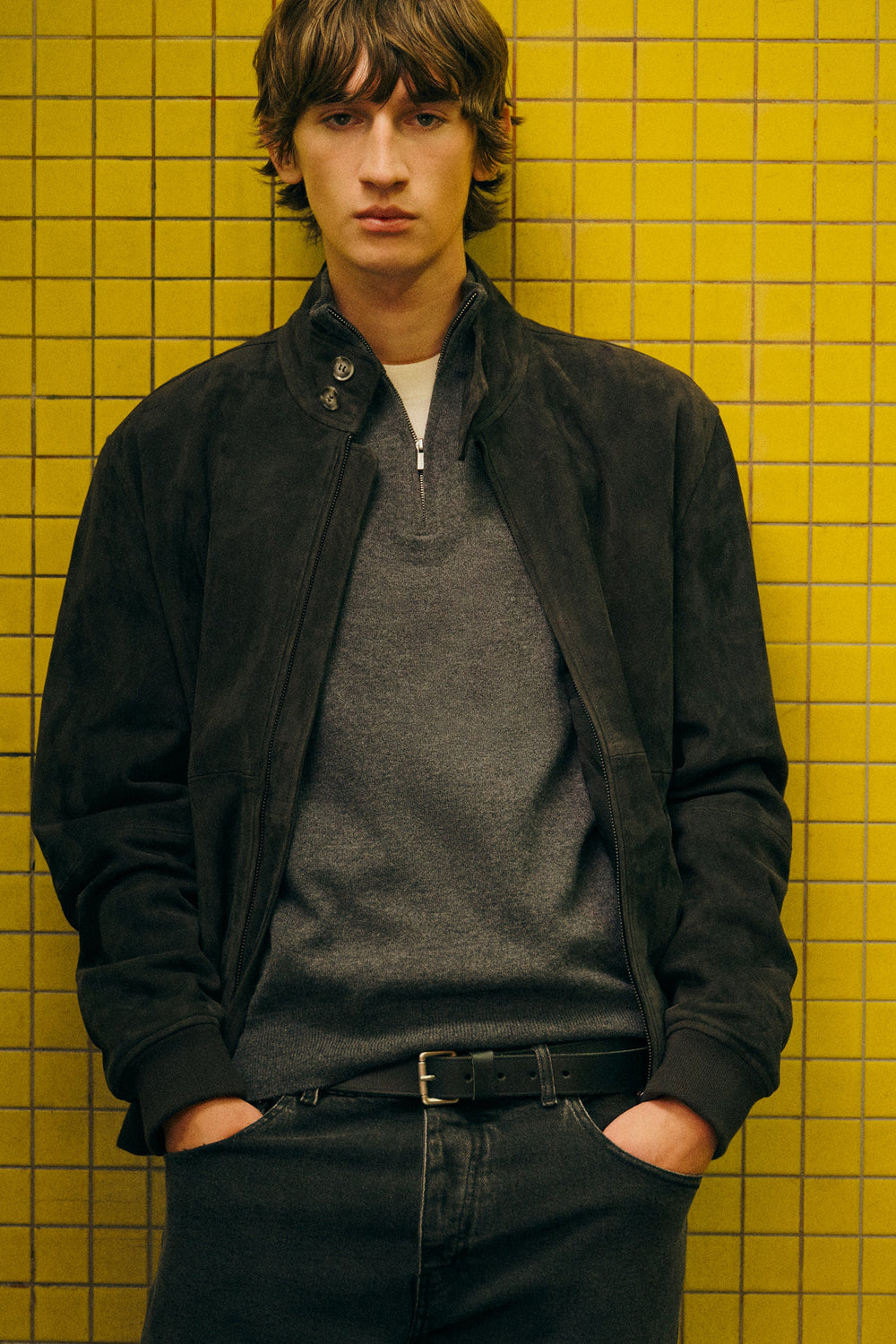 100% goatskin jacket. Fitted. Two-way zip. Ribbed collar, cuffs and waistband. Two front pockets with button fastening. Two button fastening collar.