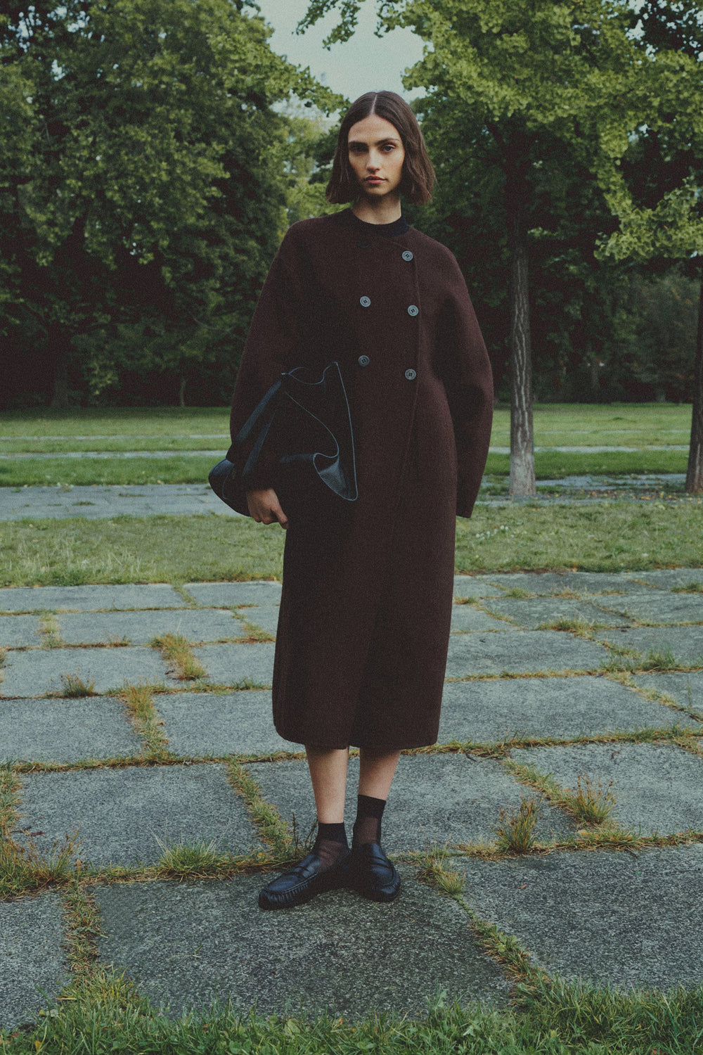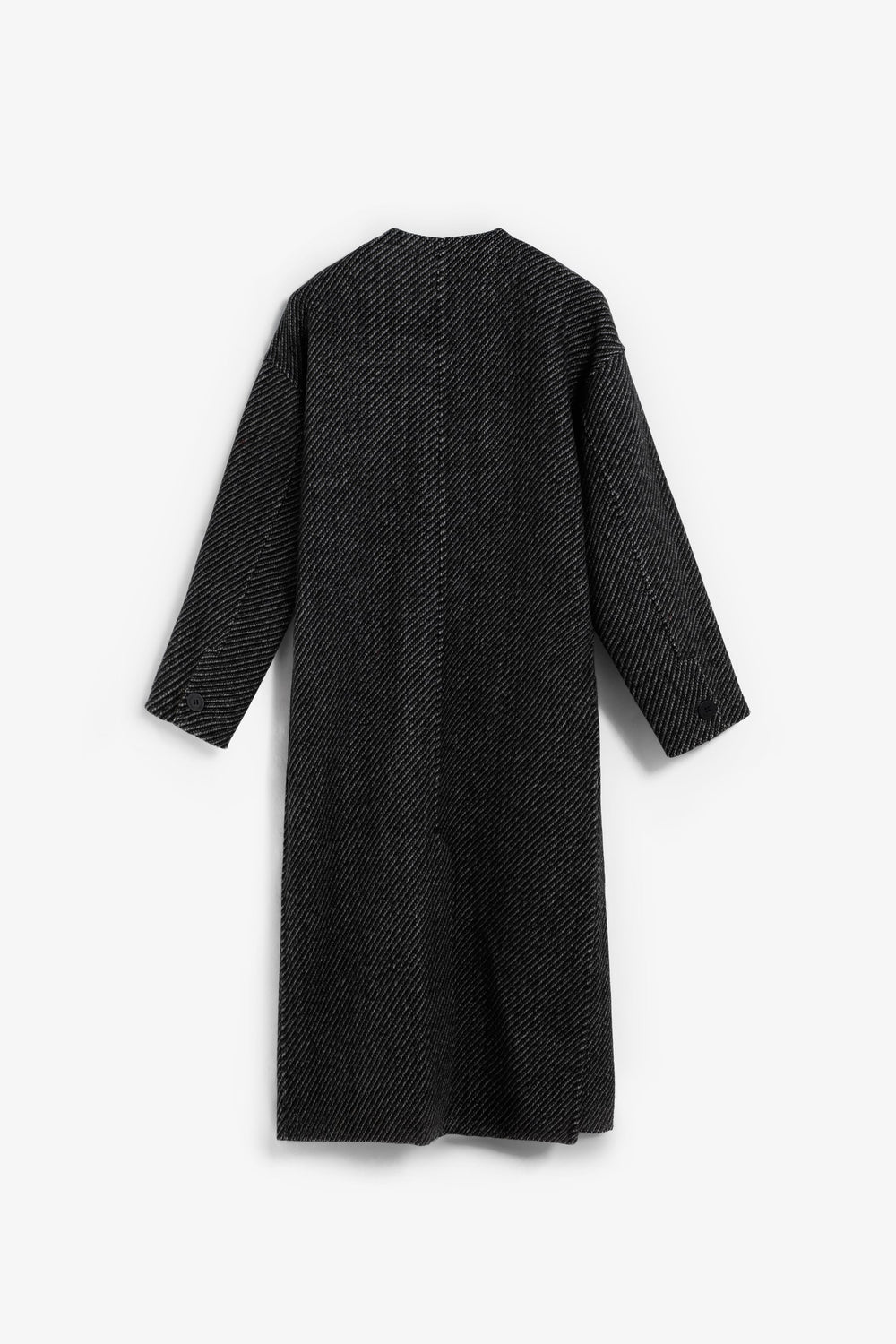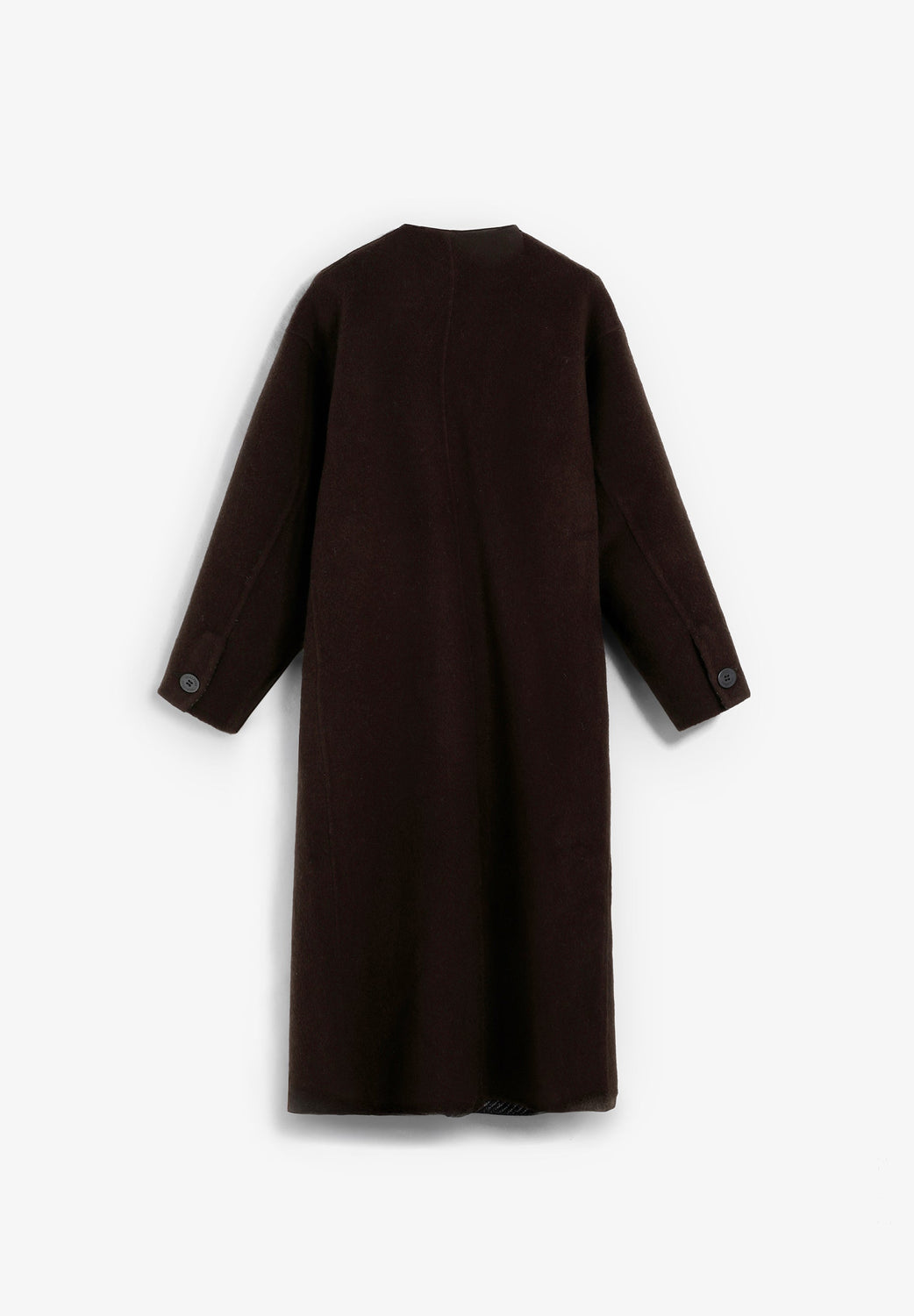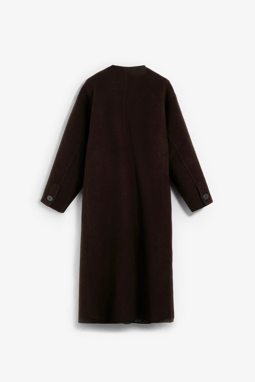 Long coat made of a reversible wool blend. Regular fit. Round collar with no lapels. Grey herringbone print and plain brown options. Patch pockets on the herringbone option and slanted pockets on the plain reverse side.