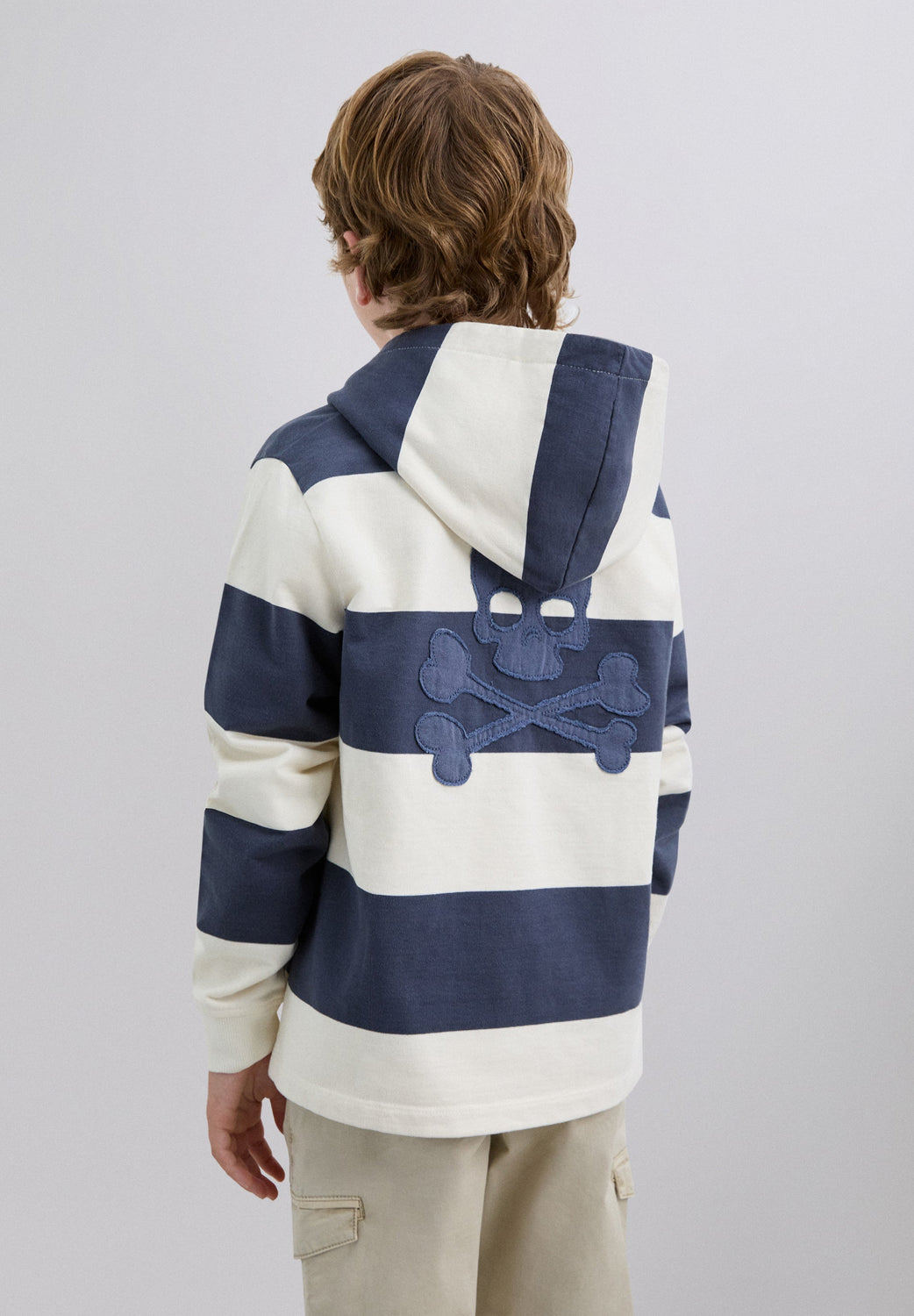 Sweat à capuche réglable avec un lien 100 % coton BCI. Imprimé rayé. Motif brodé sur la poitrine et skull dans le dos. Col boutonné devant.