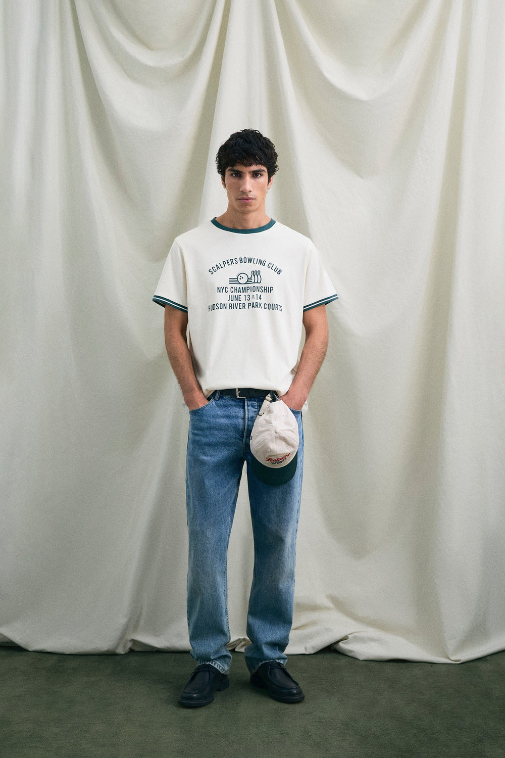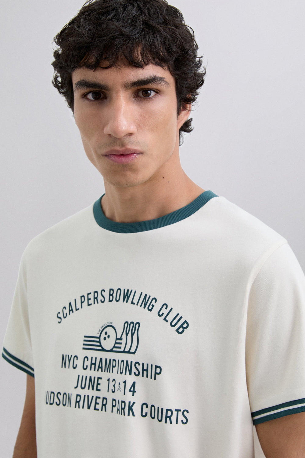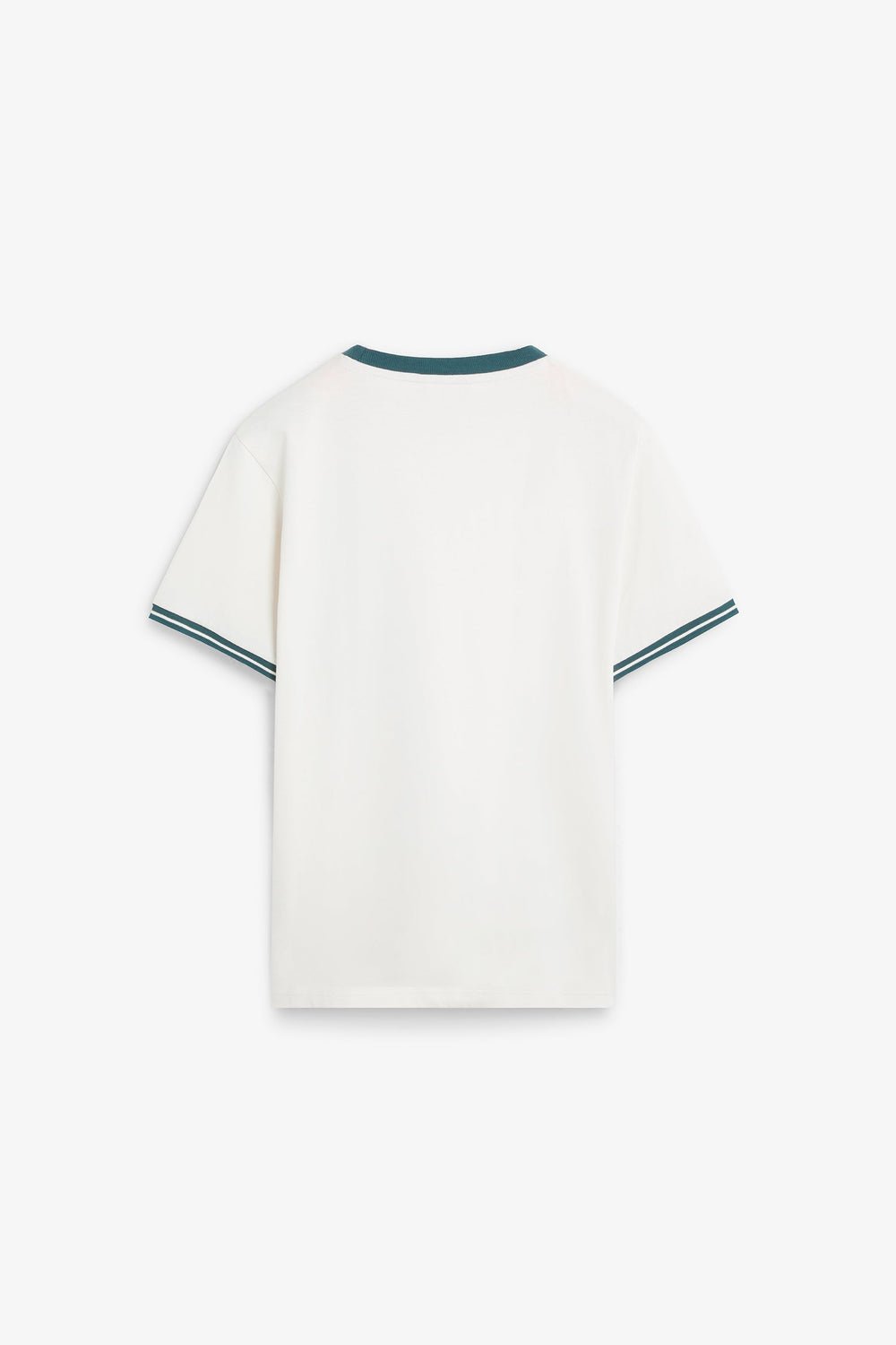 T-shirt confectionné en 100 % coton BCI. Manches courtes. Imprimé sur le devant. Coupe droite. Col et poignets en bord-côte contrastant.