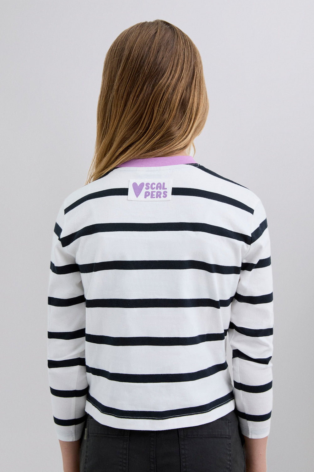 T-shirt à rayures 100 % coton BCI. Coupe droite, col rond contrastant et manches longues. Poche sur la poitrine et étiquette avec logo dans le dos.