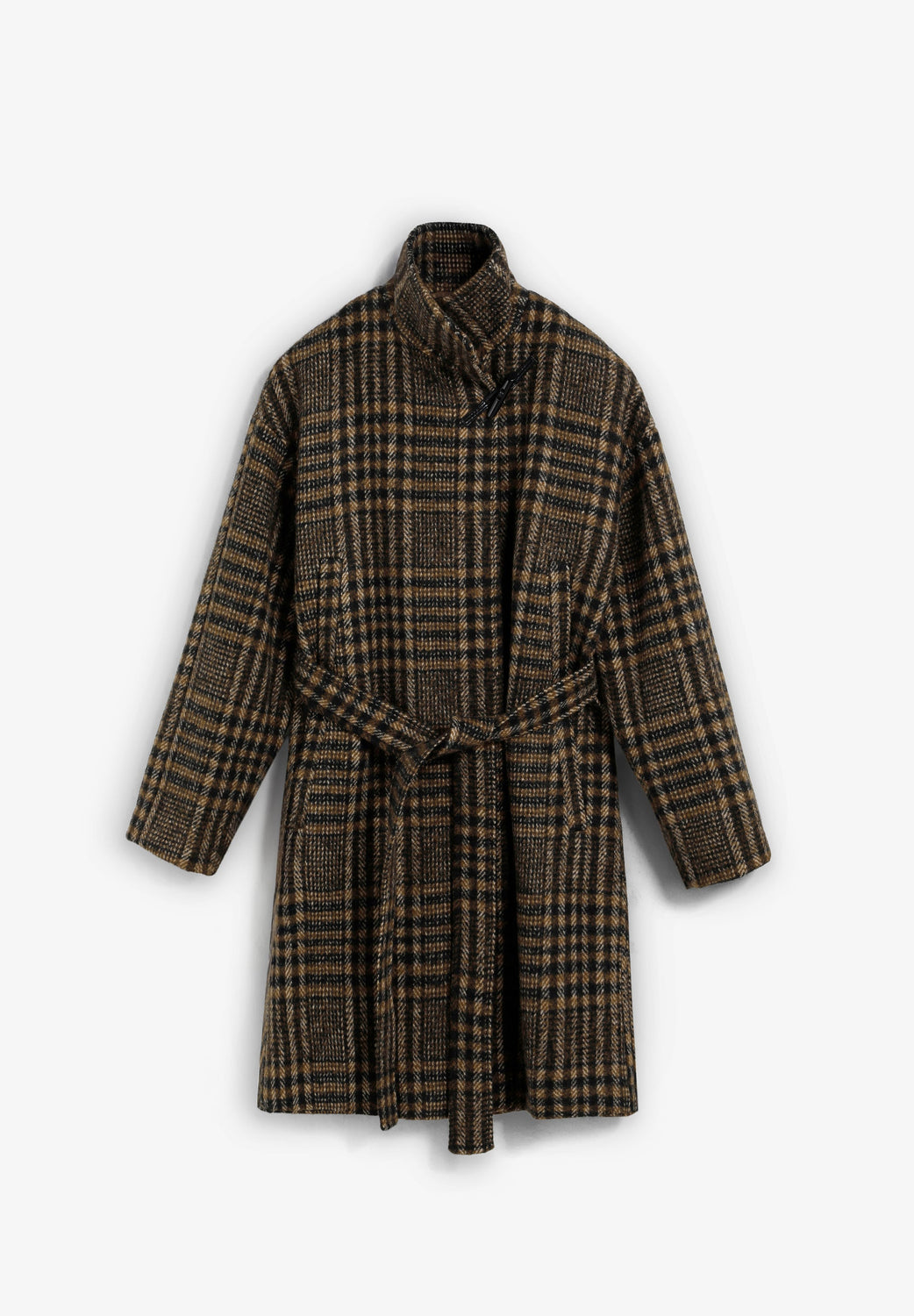 Manteau court à carreaux confectionné en laine. Col montant. Patte de boutonnage au niveau du col. 2 boutons à l’intérieur et ceinture à nouer à l’extérieur. Manches longues à poignets repliés.