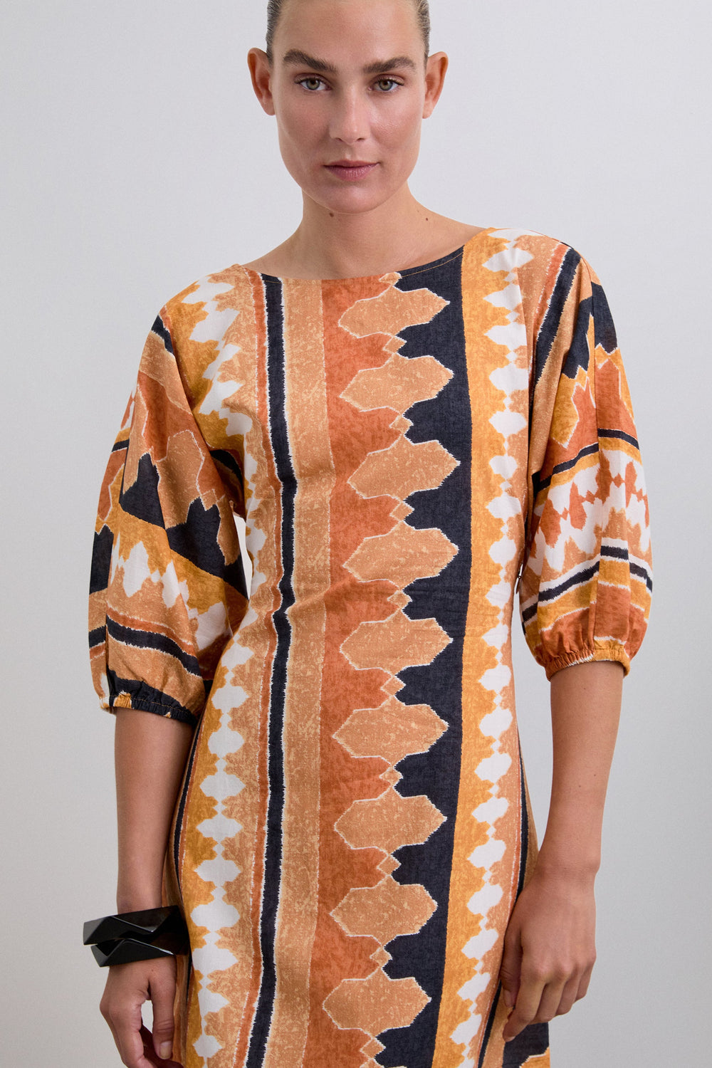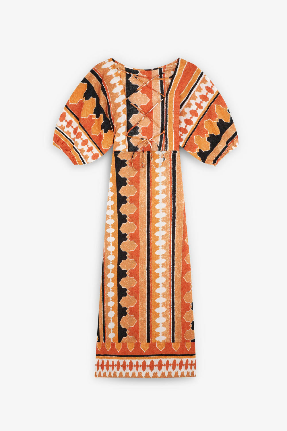 Robe midi imprimée 100 % coton bio BCI. Col rond. Ouverture lacée dans le dos. Manches courtes bouffantes. Finitions froncées.